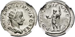Philip II. Antoninianus. 244-246 AD. Rome. (Ric-IV 218d). (Rsc-48). Anv.: M IVL PHILIPPVS CAES, Radiate, draped and cuirassed bust to right. Rev.: PRINCIPI IVVENT, Prince standing to left, holding globe and spear. Ag. Traces of luster. Slabbed by NGC as AU. Est...90,00.