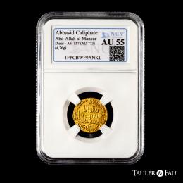 Sulayhids. 'Arwa bint Ahmad. 1/2 dinar. 487 AH?. Dhu Jibla. (Album-1078.1). (ICV-1107). Anv.: Shiite Kalima in three lines; blundered mint and date formula around. Rev.: The name of her deceased husband, al-Mukarram Ahmad b. 'Ali with his title in four lines; citing the Fatimid caliph al-Mustansir with his title as "amir al-muminin". . 1,17 g. AU. Est...400,00.