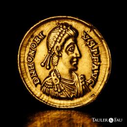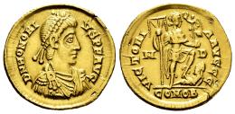 Honorius. Solidus. 394-395 AD. Mediolanum. (Ric-IX 35c = X 1206). (Depeyrot-16/2). (Toffanin-486/2). Anv.: D N HONORIVS P F AVG, pearl-diademed, draped and cuirassed bust to right. Rev.: VICTORIA AVGGG, emperor standing to right, holding labarum and Victory on globe, treading on captive to right; M-D across fields, COMOB in exergue. . 4,27 g. Nicks on the edge. Mount removed. VF/Choice VF. Est...450,00.
