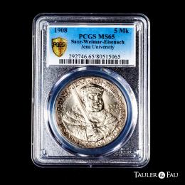 Germany. Saxe-Colburg-Gotha. Wilhelm Ernst (1901-1918). 5 mark. 1908. Berlin. A. (Km-220). (Jaeger-161). Ag. 350th anniversary of Jena University. Slabbed by PCGS as MS 65. Ex Tauler&Fau 132 (03/10/2023), lot 1026. Est...500,00.