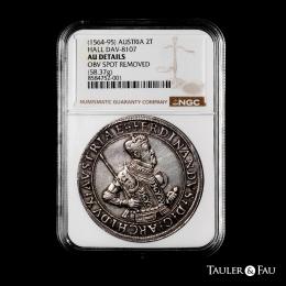 Austria. Ferdinand I. Double taler. ND (1564-95). Hall. (Dav-8107). Ag. 58,37 g. Planchet defect Very scarce. Slabbed by NGC as AU Details, Obv. Spot Removed. Choice VF. Est...1500,00.
