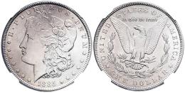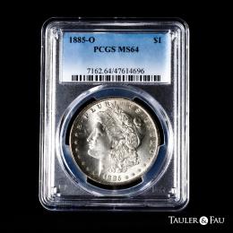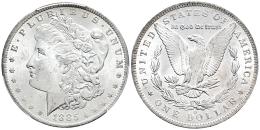 U.S. Coins. Morgan Dollars. 1 dollar. 1885. New Orleans. O. (Km-110). Ag. Plenty of original luster. Slabbed by PCGS as MS 64+. Est...150,00.