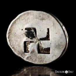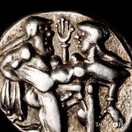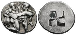 Thrace Islands. Thasos. Stater. 480-463 BC. (Hgc-6, 331). (Dewing-1323). (Svoronos-HPM, pl. X, 17). Anv.: Nude ithyphallic satyr, with long beard and long hair, moving right in 'running-kneeling' position, holding a nymph in his arms, who raises her right hand in protest. Rev.: Quadripartite incuse square. . 8,16 g. Ex Num. Naumann 76 (07/04/2019), lot 43. Choice VF. Est...600,00.