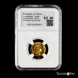 Kings of Pontos. Mithradates VI Eupator. Stater. 88-86 BC. Tomis. First Mithradatic War issue. Struck in the name and types of Lysimachos of Thrace. (Callataÿ-p. 141 (D4/R1)). (AMNG-I 2480). (Sng Cop-1091). Anv.: Diademed head of the deified Alexander to right, with horn of Ammon. Rev.: Athena Nikephoros seated to left, shield at her side; ΒΑΣΙΛΕΩΣ to right, ΛΥΣΙMΑXOY to left; ΘΕΜ to inner left, TO on throne, ornamented trident in exergue. . 8,26 g. Slabbed by NCV as XF 40. Ex Soler & Llach 1130 (26/04/2023), lot 10. Est...2500,00.