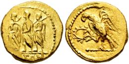 Thrace. Koson. Stater. 44-42 BC. (RPC-I 1701A). (Bmc-2). (Hgc-3.2,2.49). Anv.: Roman consul (L. Junius Brutus?) walking to left, accompanied by two lictors; OΛB monogram before, KOΣΩN in exergue. Rev.: Eagle with spread wings standing to left on sceptre, clutching laurel wreath in right talon. . 8,42 g. Lightly displaced struck. Choice VF. Est...1200,00.
