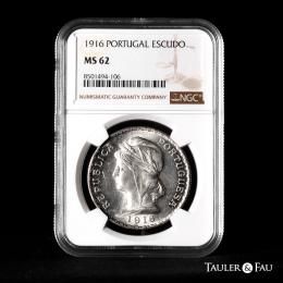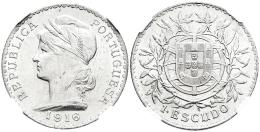 Portugal. 1 escudo. 1916. Lisbon. (Km-564). (Gomes-23.02). Ag. Slabbed by NGC as MS 62. Est...90,00.