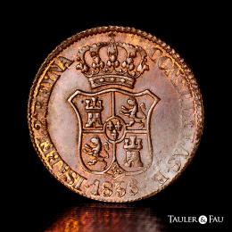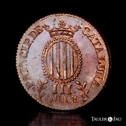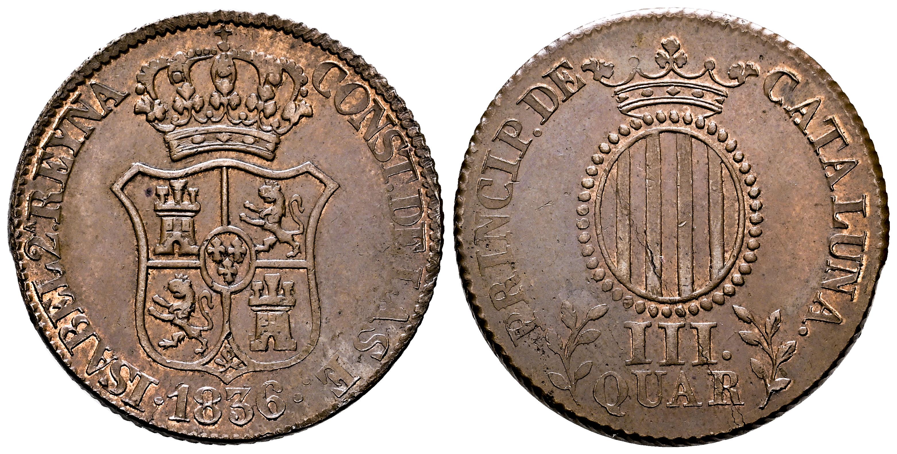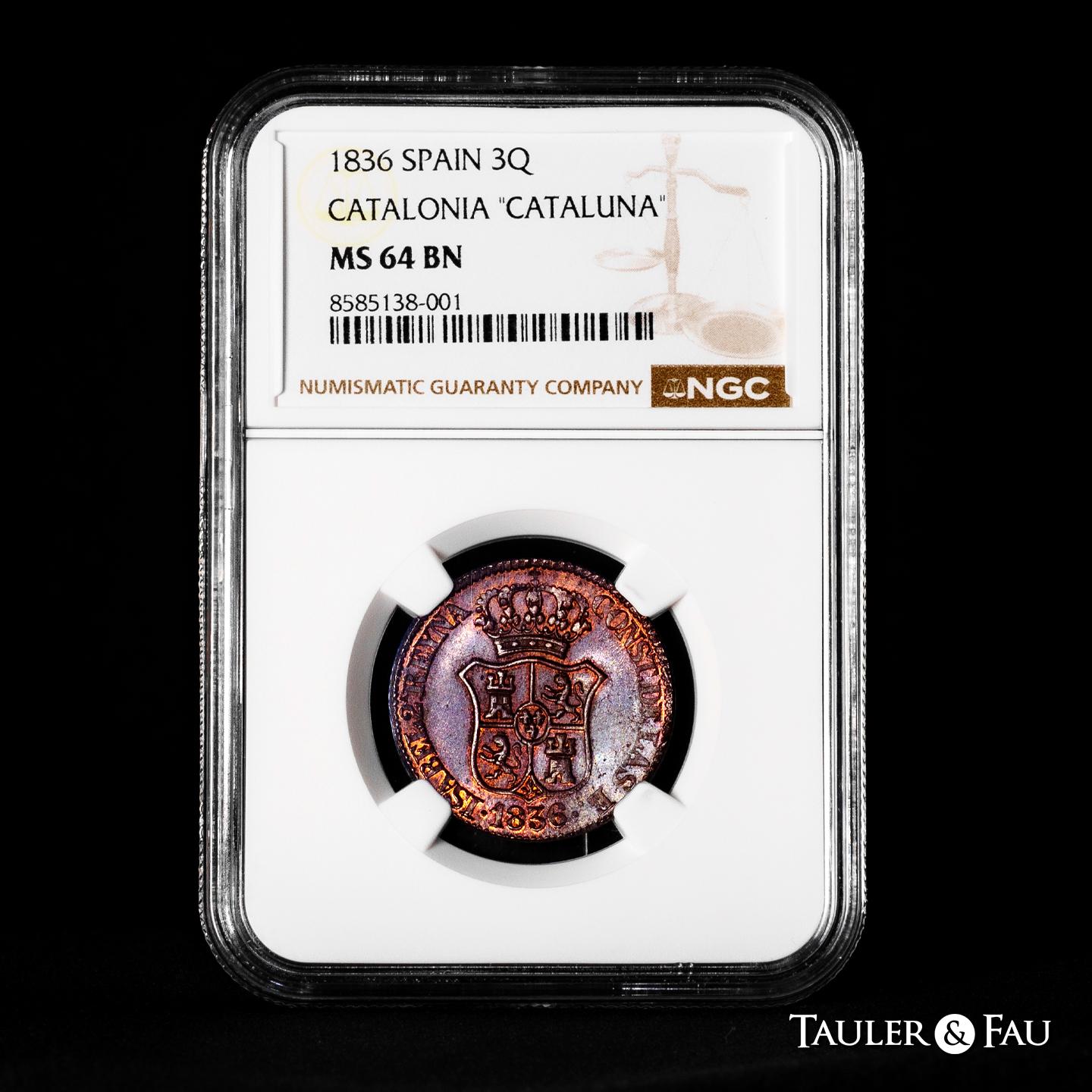 Isabel II (1833-1868). 3 cuartos. 1836. Cataluña. (Cal-2). Ae. 6,79 g. Valor III QUAR y leyenda CATALUÑA. Magnífico ejemplar con brillo original y un precioso color. Muy rara, más en esta conservación. Encapsulada por NGC como MS 64 BN (Top Pop), el mejor ejemplar conservado en el censo de NGC. Ex Áureo&Calicó Selección (17/03/2011) lote 359. Est...2000,00.