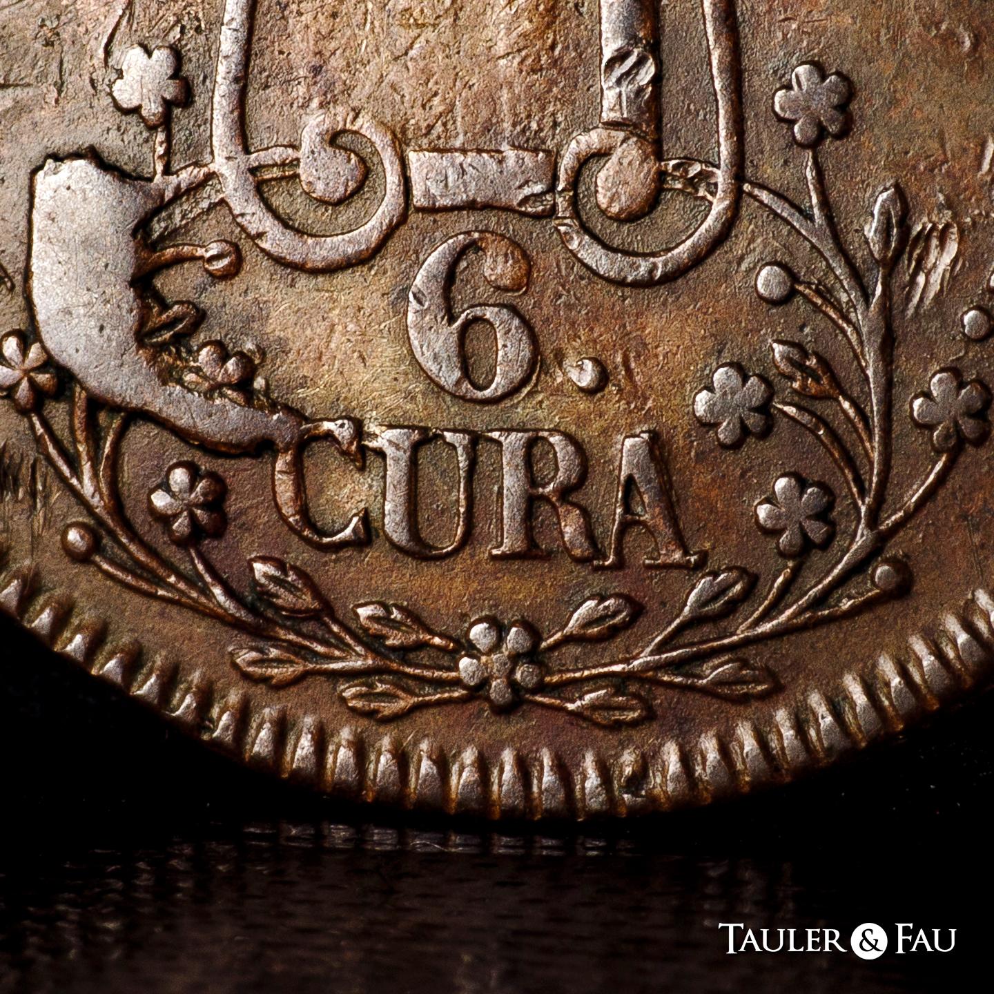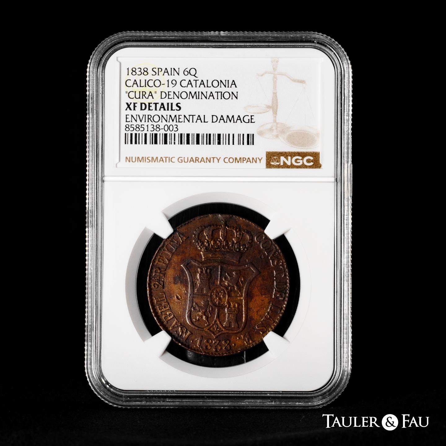 Isabel II (1833-1868). 6 cuartos. 1838. Barcelona. "6 CURA". (Cal-19). Ae. 15,25 g. Leves golpecitos y exceso de metal en reverso. Muy rara. Encapsulada por NGC como XF Details, Environmental damage. Ex Martí Hervera (05/07/2011), lote 685. Est...1200,00.