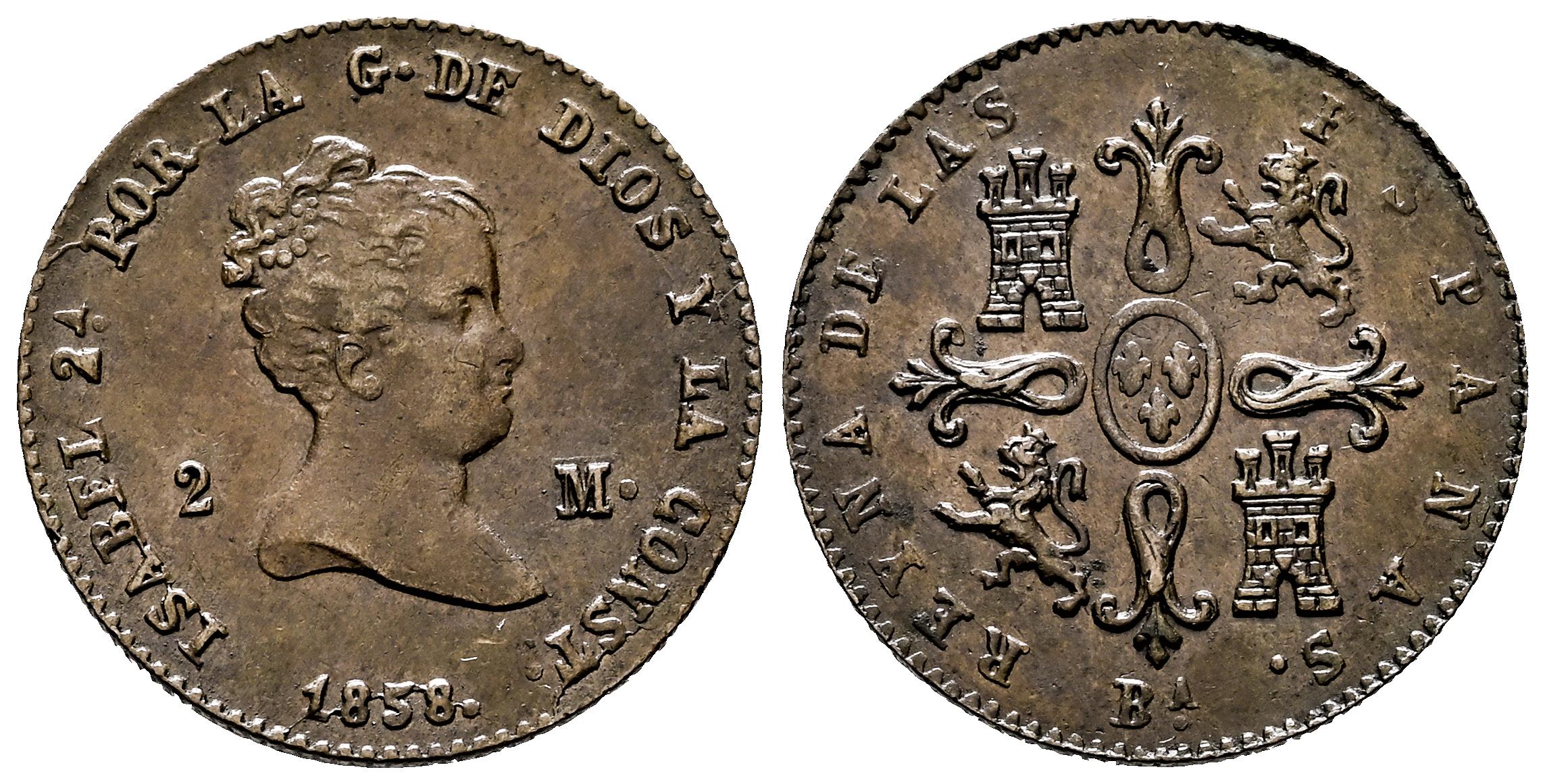 Isabel II (1833-1868). 2 maravedís. 1858. Barcelona. (Cal-37). Ae. 2,20 g. Escasa. MBC+/EBC-. Est...70,00.