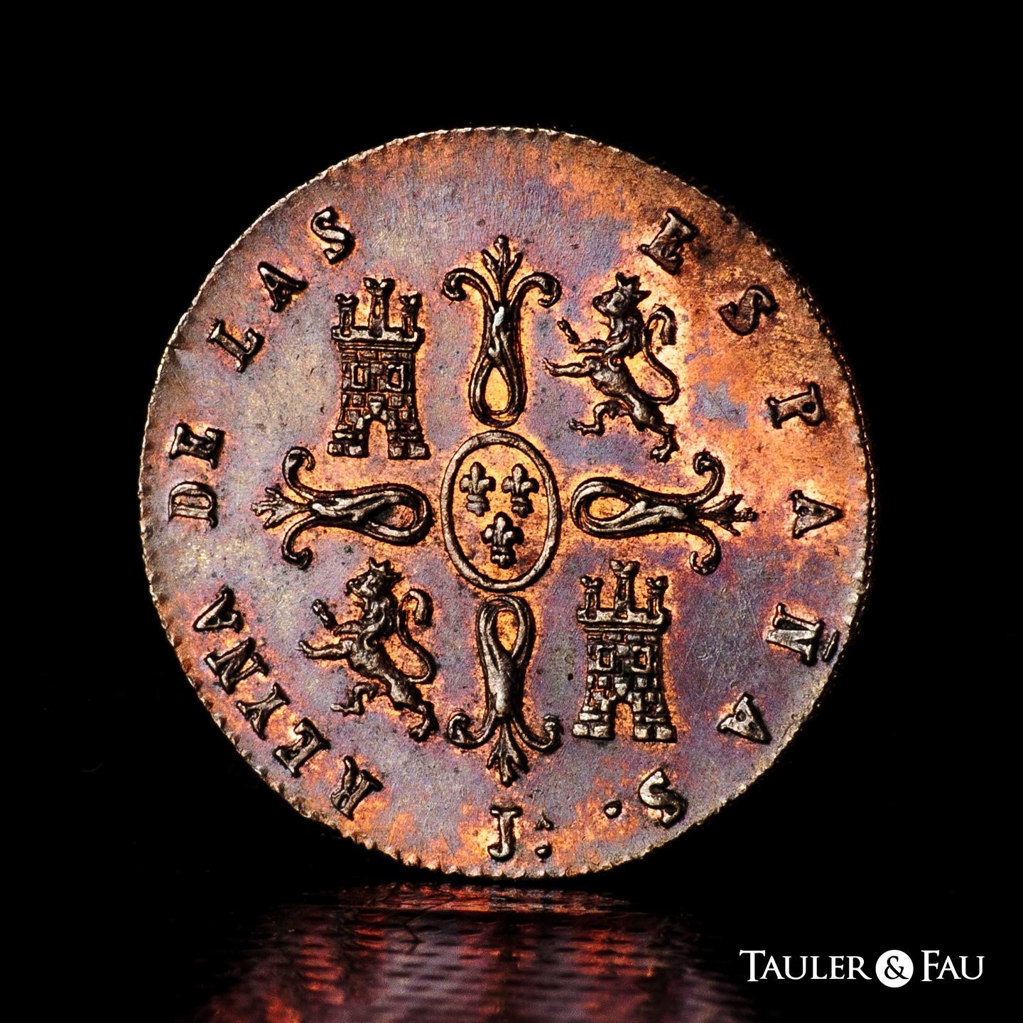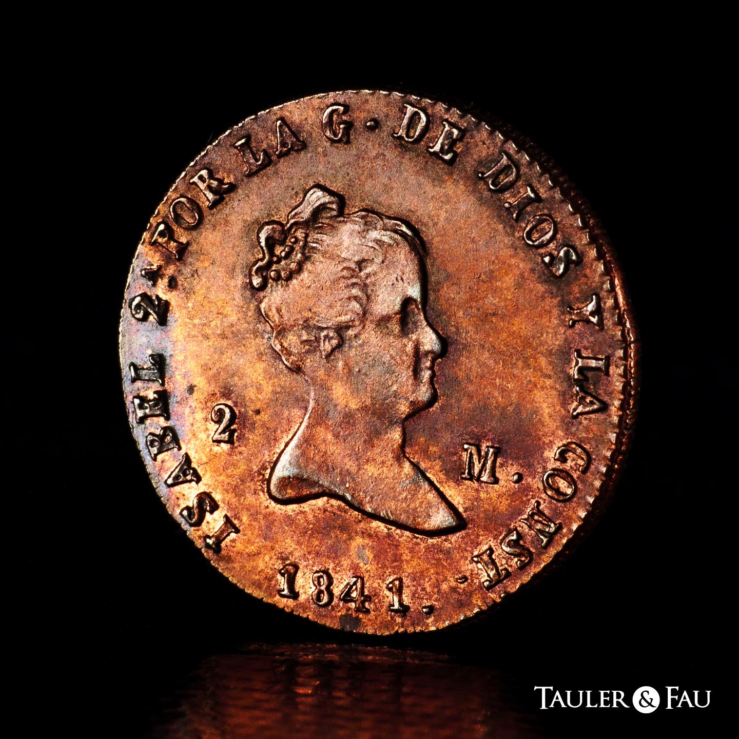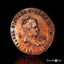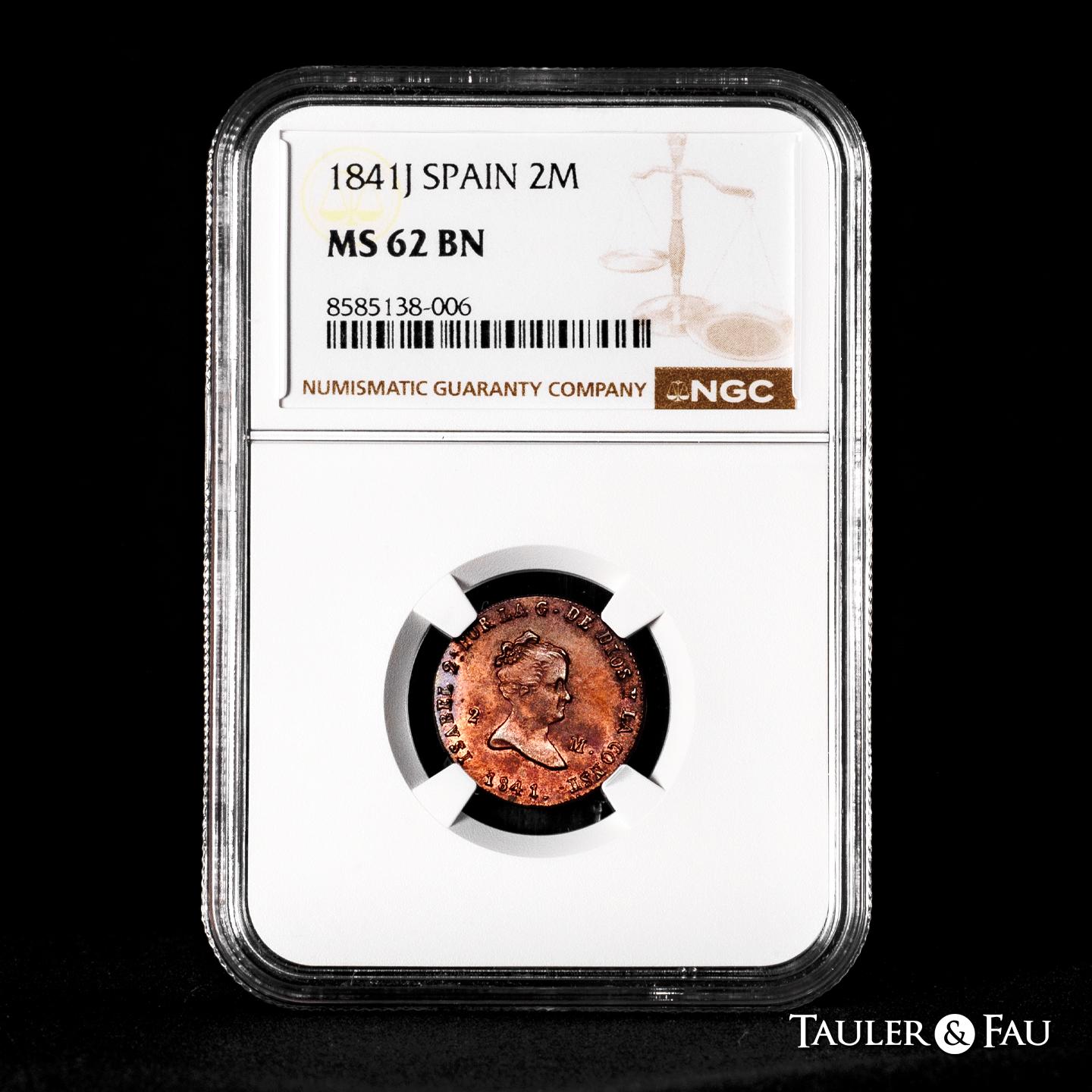 Isabel II (1833-1868). 2 maravedís. 1841. Jubia. (Cal-43). Ae. 2,48 g. Marca de ceca JA. Restos de brillo original. Muy rara en esta conservación. Encapsulada por NGC como MS 62 BN. Solamente 1 ejemplar mejor conservado según el censo de NGC. Est...600,00.