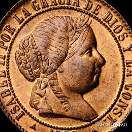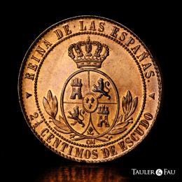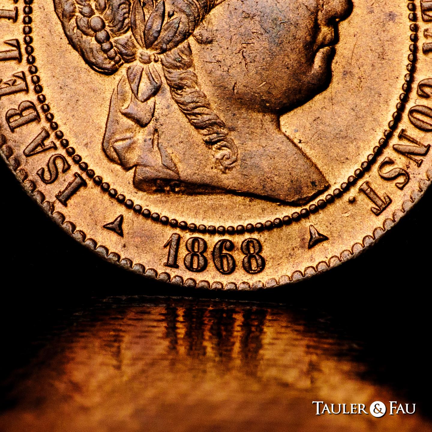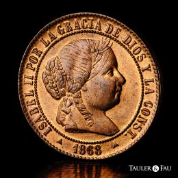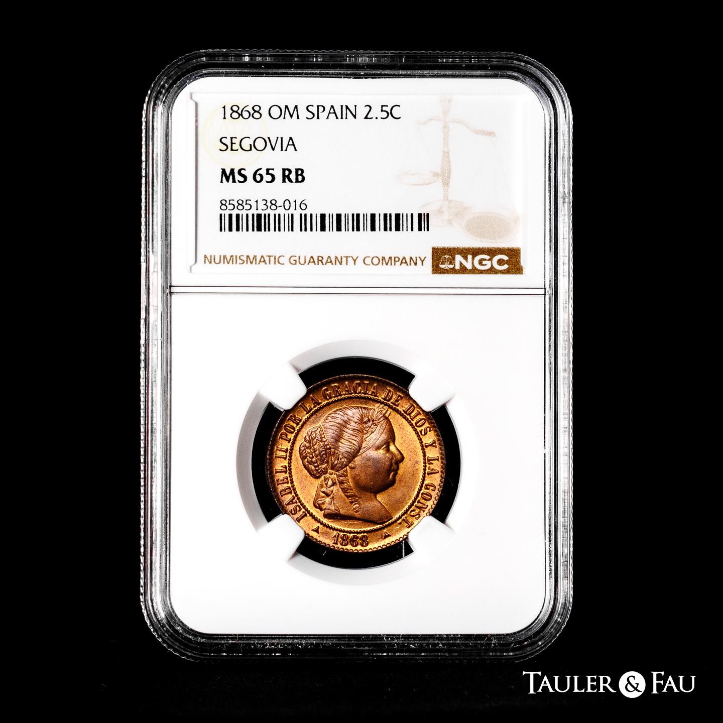 Isabel II (1833-1868). 2 1/2 céntimos de escudo. 1868. Segovia. OM. (Cal-241). Ae. 6,36 g. Magnífico ejemplar con pleno brillo original. Tan solo un insignificante golpecito en el canto. Muy rara en esta conservación. Encapsulada por NGC como MS 65 RB (Top Pop), el mejor ejemplar conservado en el censo de NGC. Ex Tauler&Fau (23/10/2023), lote 3172. Est...350,00.