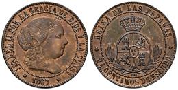 Isabel II (1833-1868). 2 1/2 céntimos de escudo. 1867. Sevilla. OM. (Cal-242). Ae. 6,44 g. Bonito color. EBC. Est...100,00.