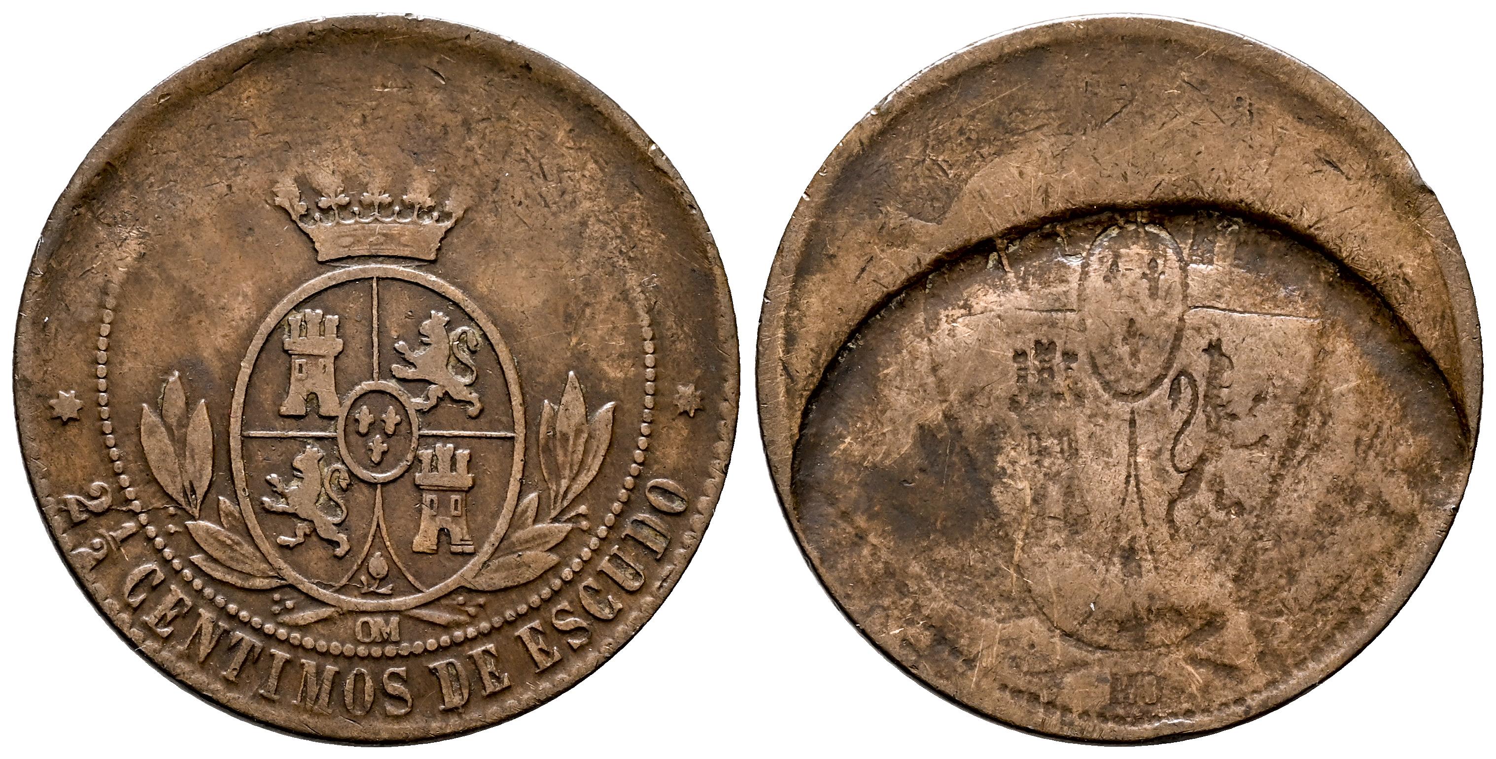Isabel II (1833-1868). 2 1/2 céntimos de escudo. Sevilla. OM. Ae. 6,35 g. Incusa. Muy rara. Ex Tauler&Fau (28/06/2022), lote 1755. MBC-. Est...200,00.