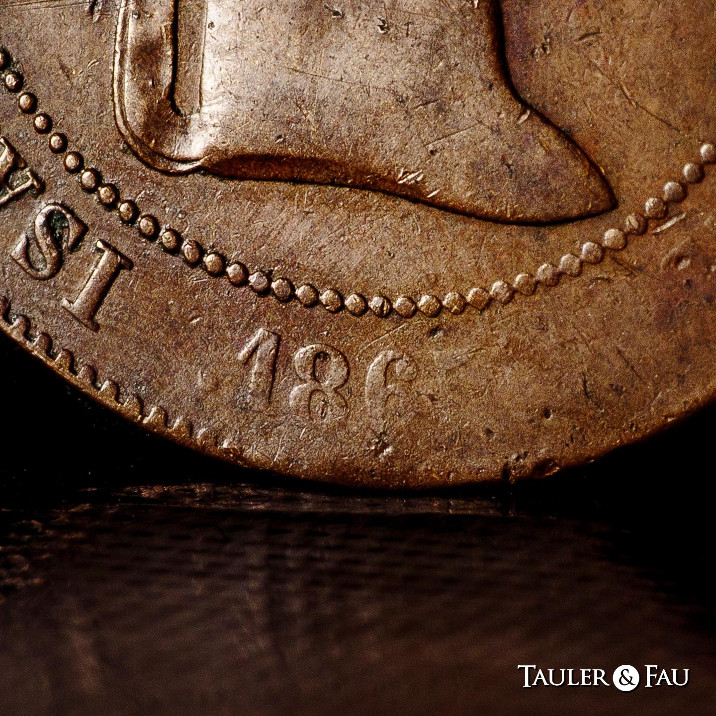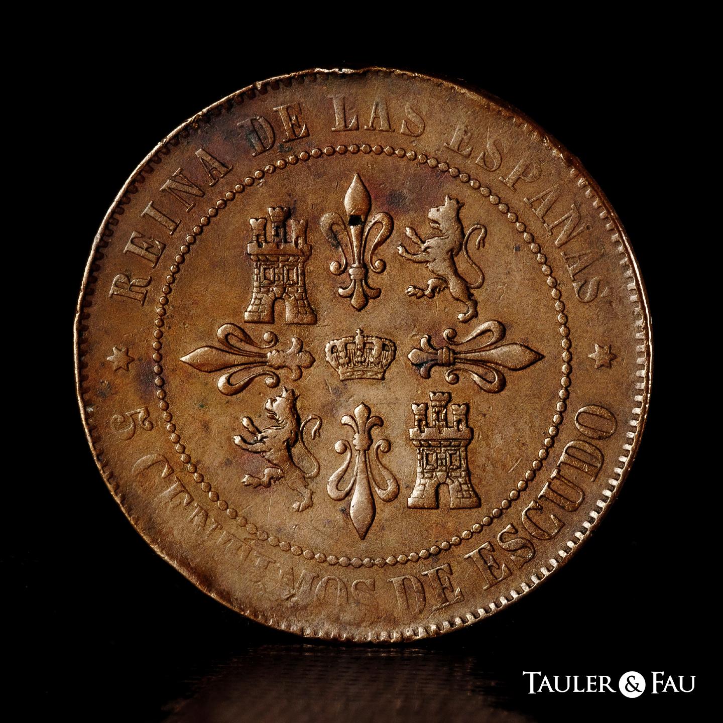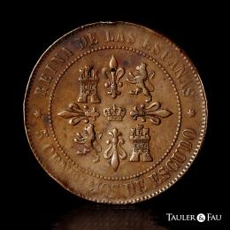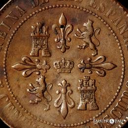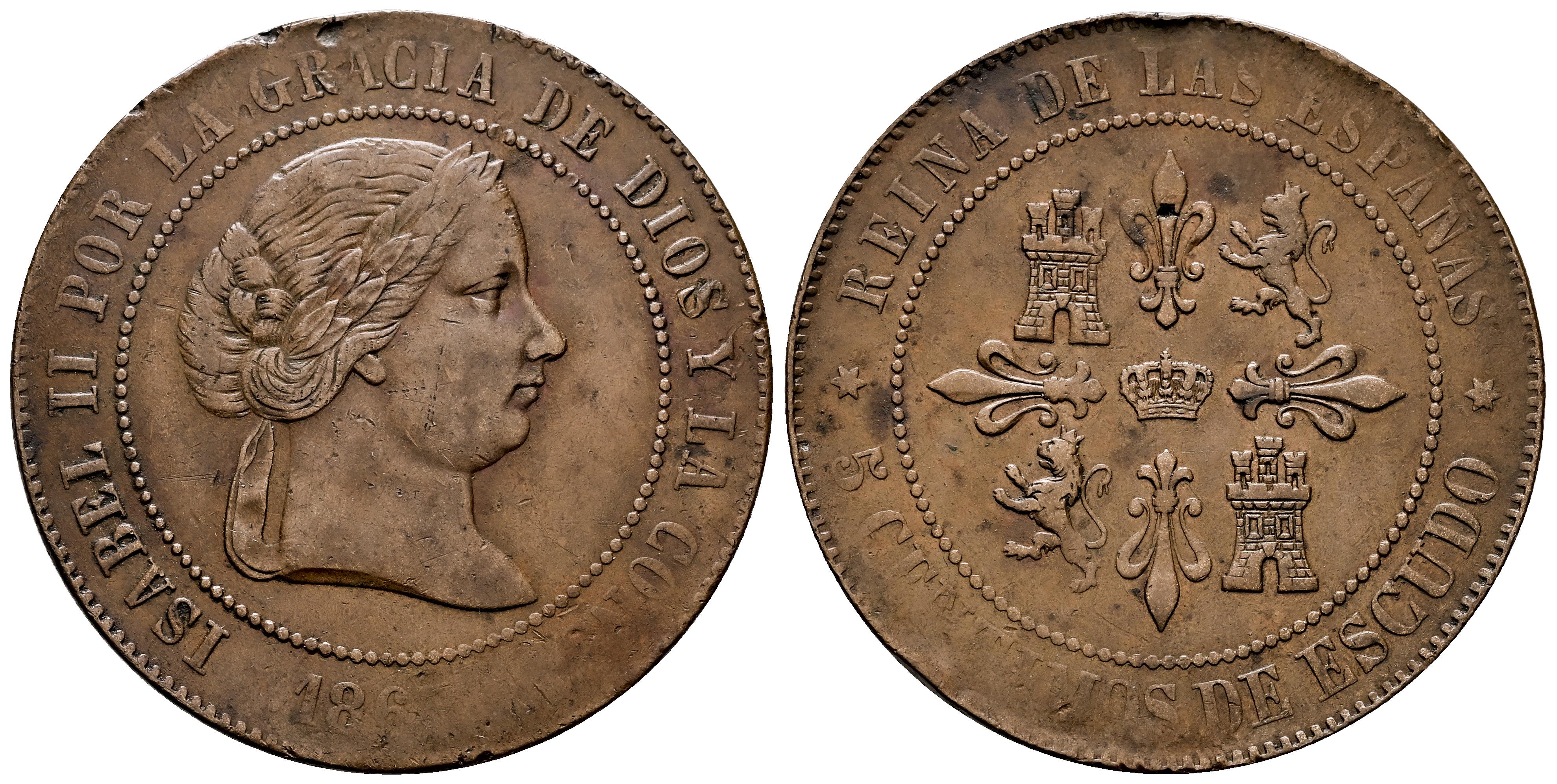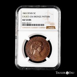 Isabel II (1833-1868). 5 céntimos de escudo. 1865. Madrid. (Cal-254). Ae. 12,39 g. Prueba no adoptada. Golpecitos y ligero vano. Rarísima. Encapsulada por NGC como AU 53 BN (Top Pop), el mejor ejemplar conservado en el censo de NGC. Ex Cayón (31/01/2018), lote 5053. Est...1500,00.