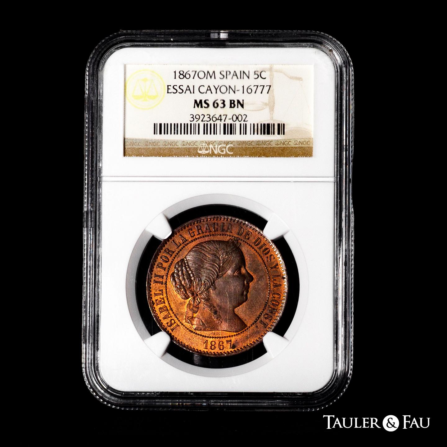 Isabel II (1833-1868). 5 céntimos de escudo. 1867. París. OM. (Cal-257). Ae. Sin marca de ceca. ESSAI - BRONZE en reverso. Bellísima. Muy rara. Encapsulada por NGC como MS 63 BN. Ex Gadoury (15/11/2019), lote 790; Ex Áureo & Calicó 266 (12/03/2015), lote 390. Est...3500,00.