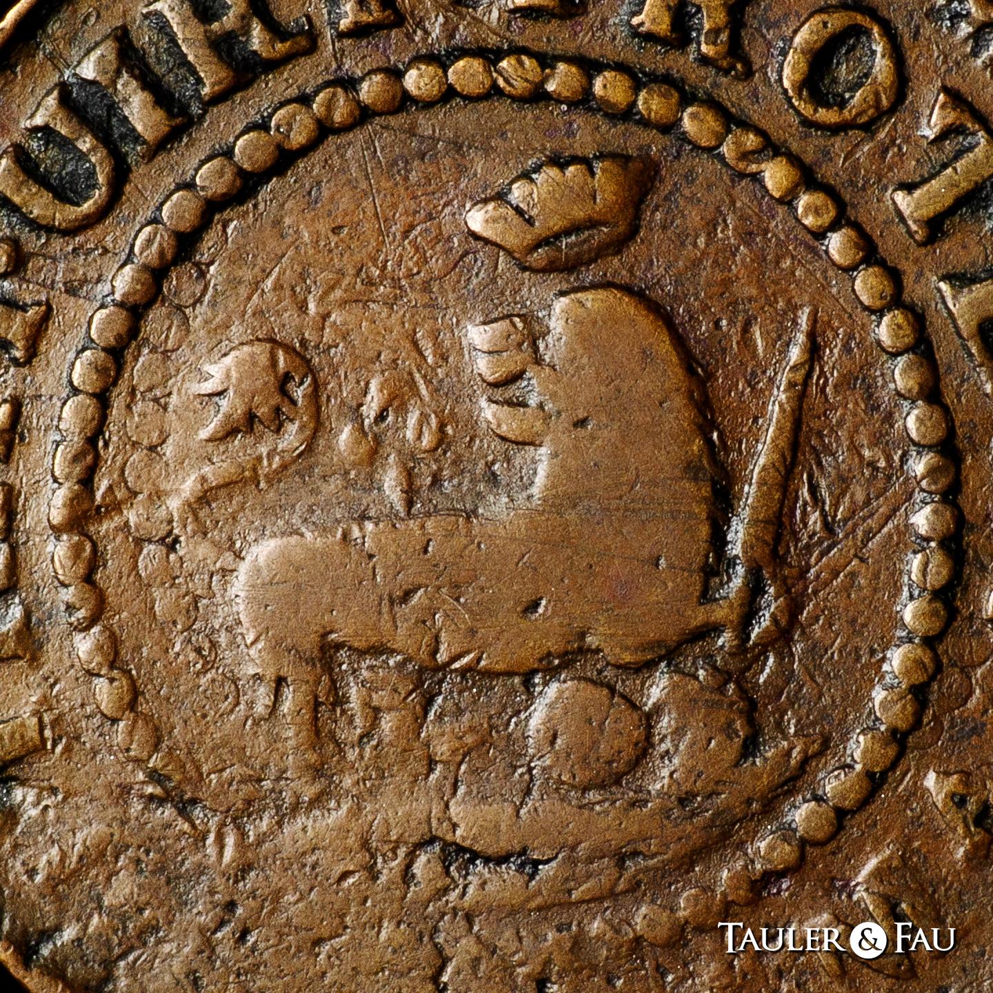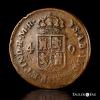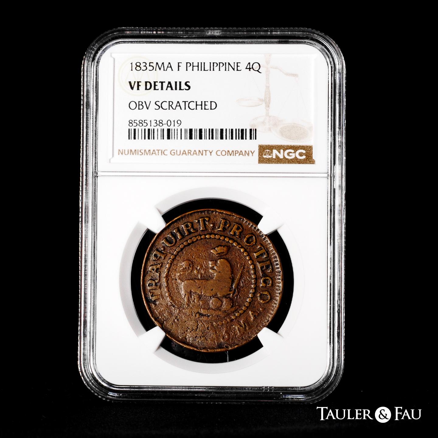 Isabel II (1833-1868). 4 cuartos. 1835. Manila. MR. (Cal-266). (Basso-46). (Km-15). Ae. 13,82 g. Ligera doble acuñación del valor 4. Golpecitos y vano que afecta a gran parte de la fecha. Muy rara. Encapsulada por NGC como VF Details, Obv. scratched. Est...3000,00.