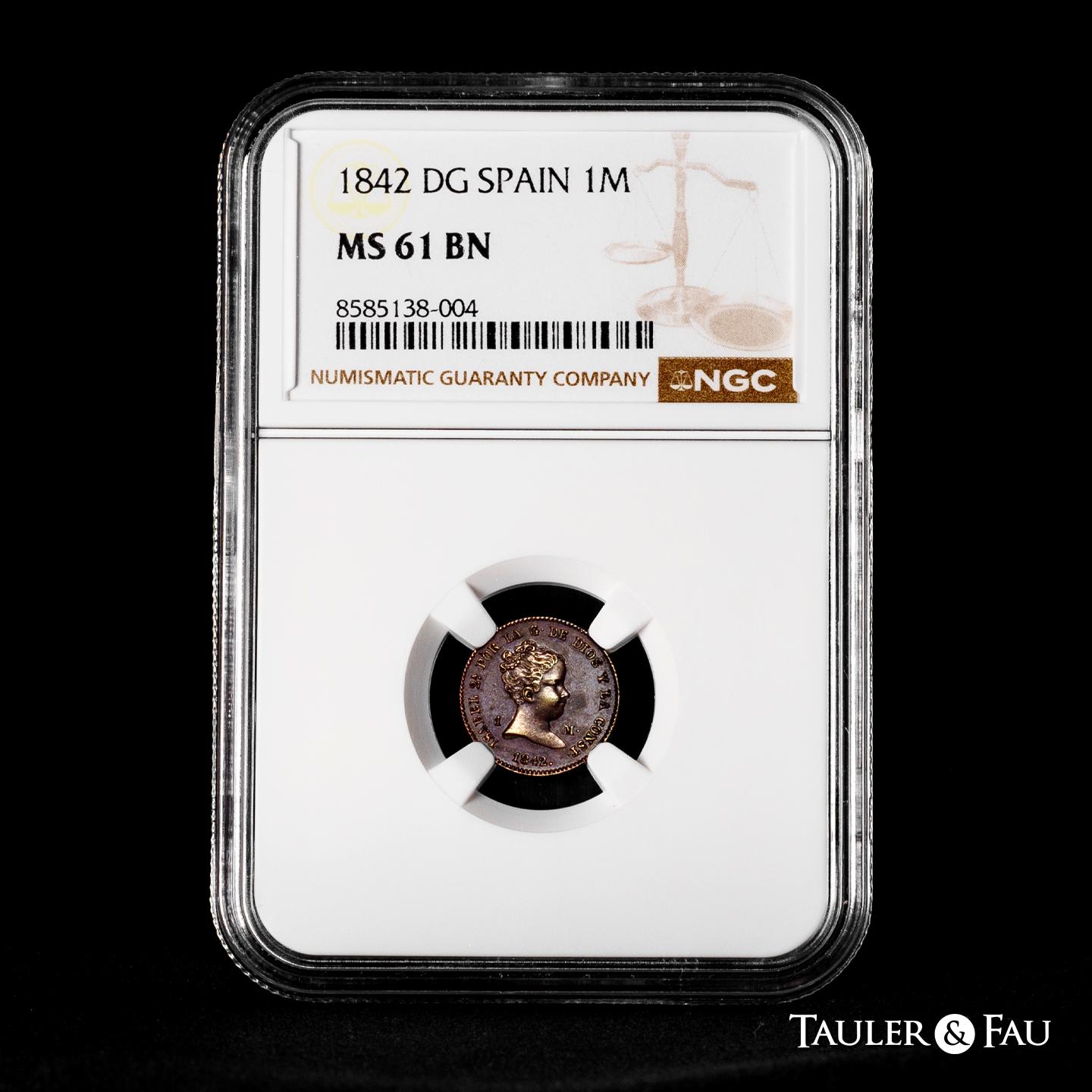 Isabel II (1833-1868). 1 maravedí. 1842. Madrid. DG (Departamento de Grabado). (Cal-34). Ae. 1,14 g. Bonito color. Rara, más en esta conservación. Encapsulada por NGC como MS 61. Est...350,00.