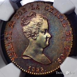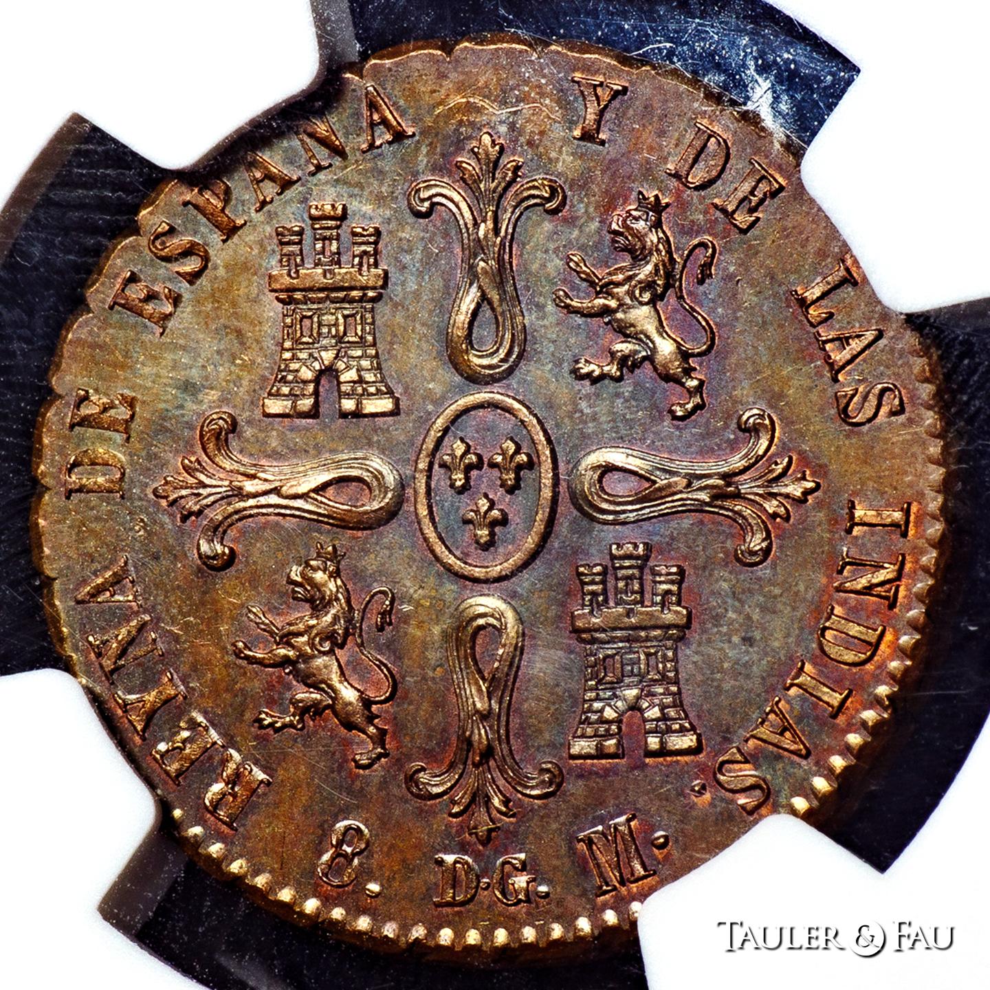 Isabel II (1833-1868). 8 maravedís. 1835. Madrid. DG (Departamento de Grabado). (Cal-118). Ae. 11,43 g. Valor en reverso. Brillo original. Precioso color y excelente atractivo visual. Muy rara. Encapsulada por NGC como MS 62 BN. Solamente 1 ejemplar mejor conservado según el censo de NGC. Est...2000,00.