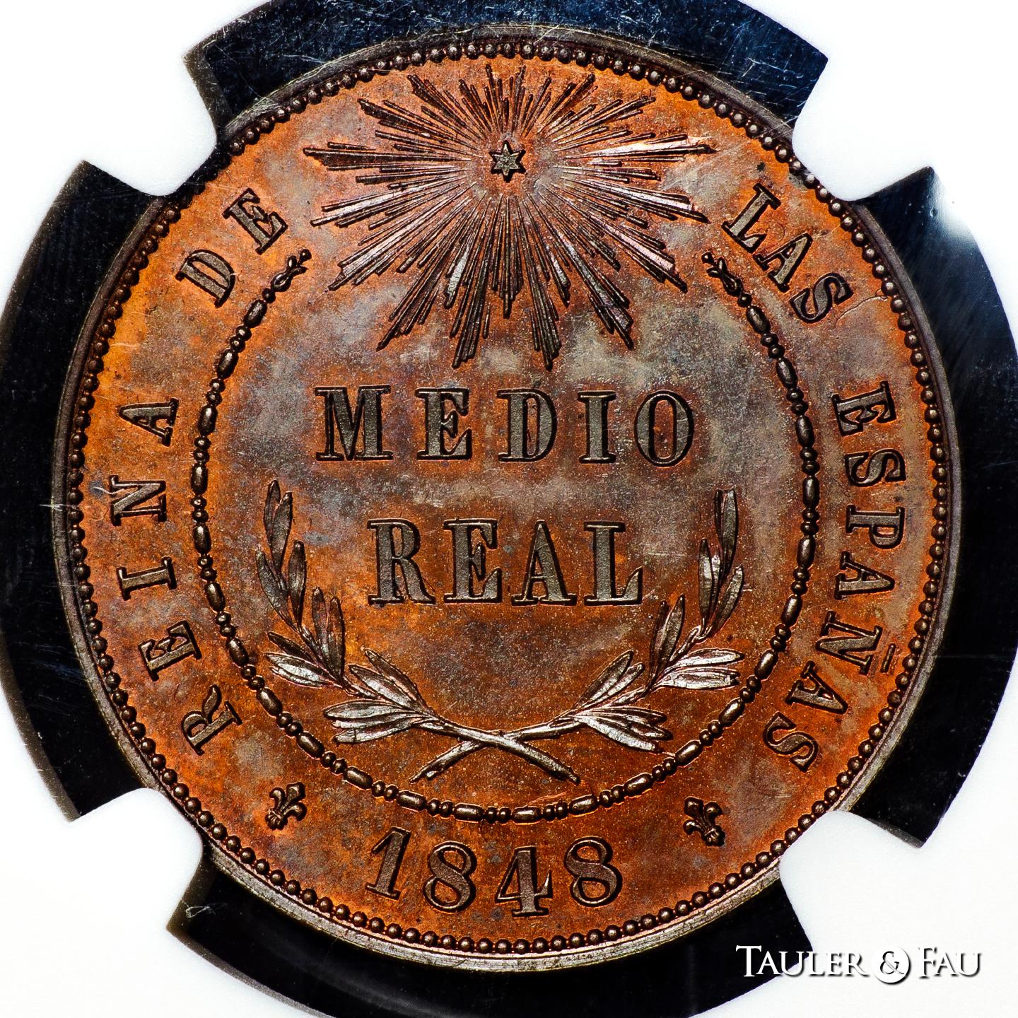 Isabel II (1833-1868). Medio real. 1848. Madrid. DG (Departamento de Grabado). (Cal-150). Ae. Magnífica prueba en cobre no adoptada con brillo original y un precioso color que acentúa su excelente atractivo visual. Canto estriado. Extremadamente rara y probablemente la mejor conocida.