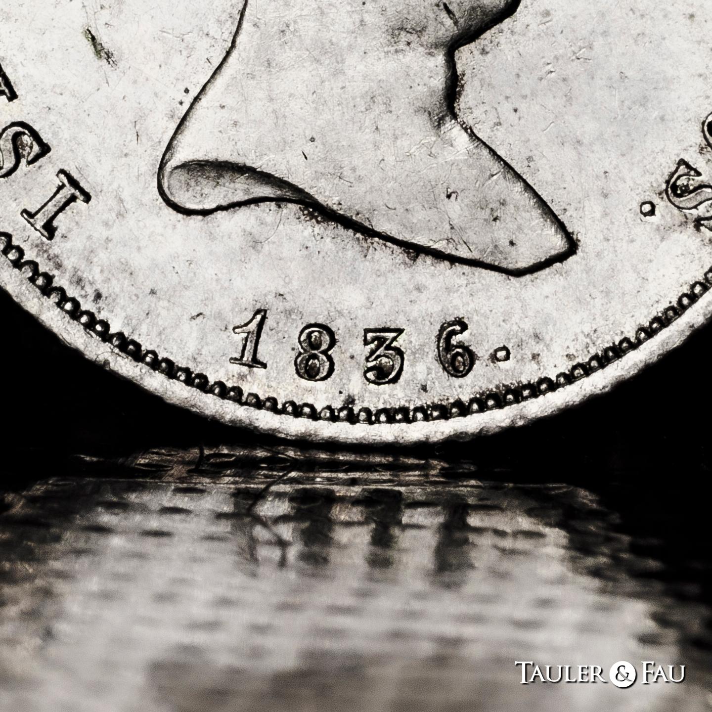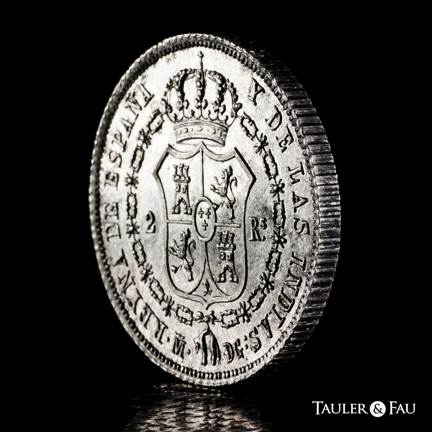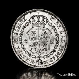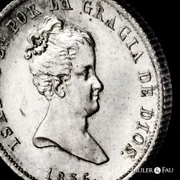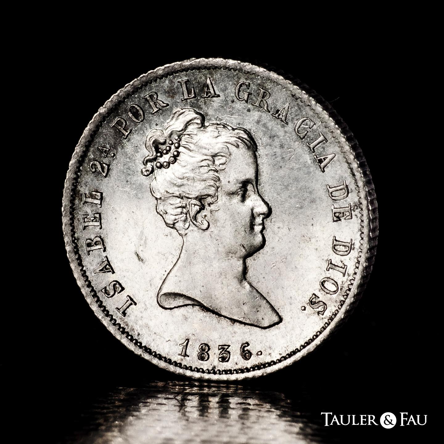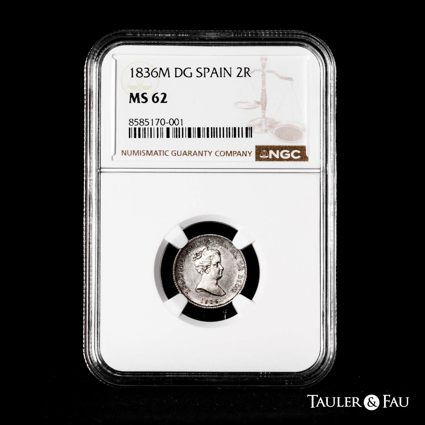 Isabel II (1833-1868). 2 reales. 1836. Madrid. DG (Departamento de Grabado). (Cal-353). Ag. 3,01 g. Pleno brillo original. Atractiva. Muy rara, más en esta conservación. Encapsulada por NGC como MS 62 (Top Pop), el mejor ejemplar conservado en el censo de NGC. Est...1200,00.
