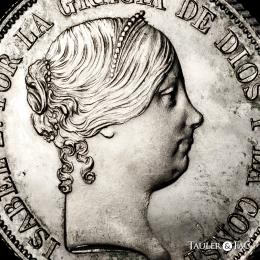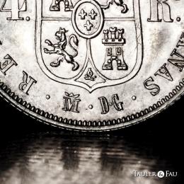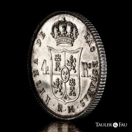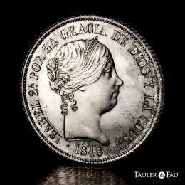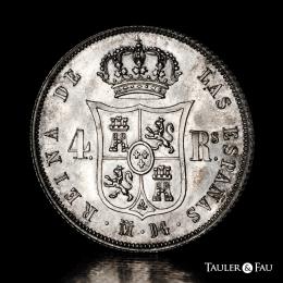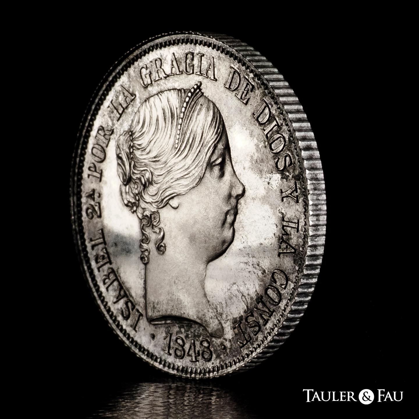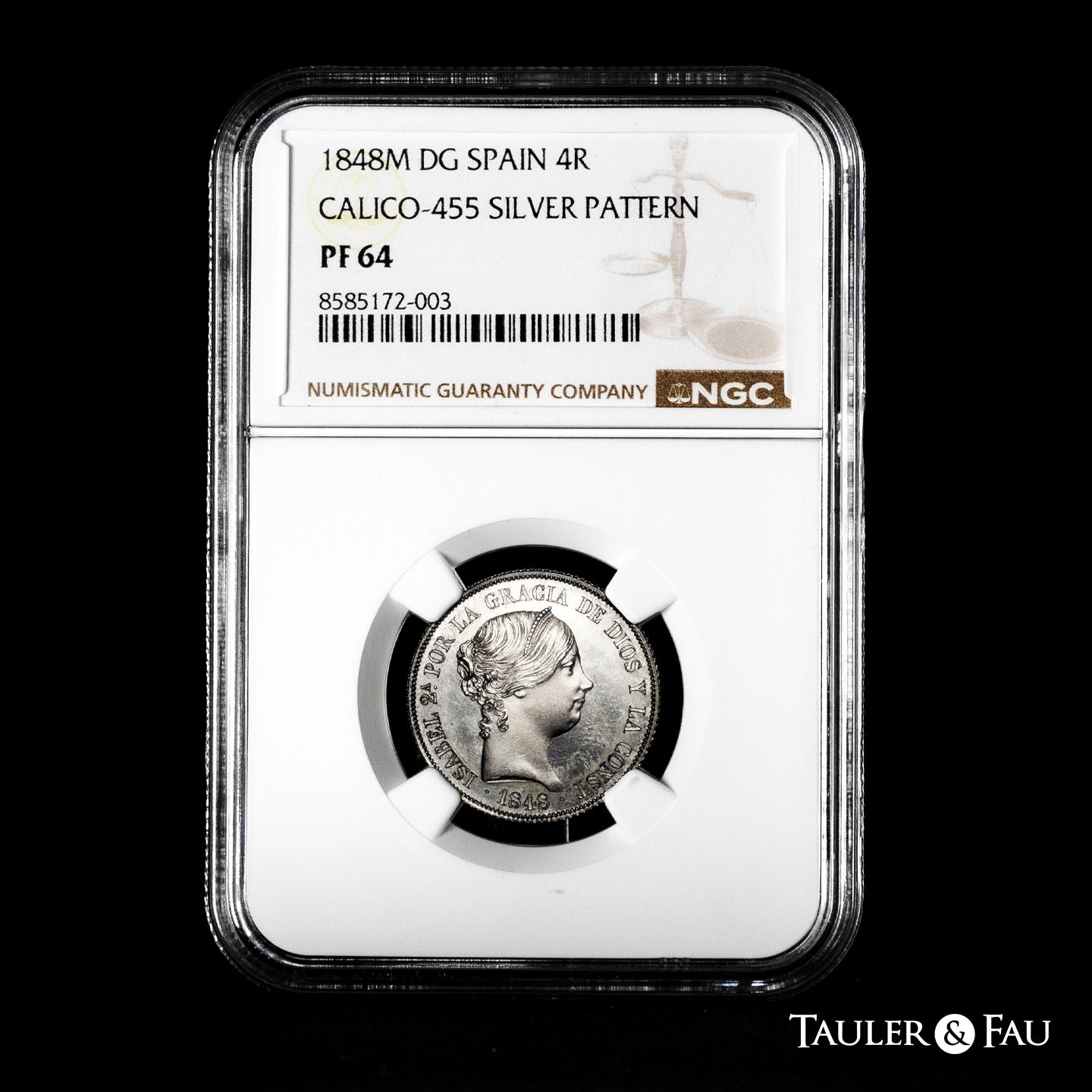 Isabel II (1833-1868). 4 reales. 1848. Madrid. DG (Departamento de Grabado). (Cal-455). Ag. 5,26 g. Extremadamente rara, solo tenemos constancia de otros 2 ejemplares subastados en los últimos 20 años, este sería el tercero. Bellísima acuñación de muy fino estilo y con pleno brillo original. Estamos seguro de que llamará la atención de cualquier coleccionista. Encapsulada por NGC como PF 64 (Top Pop) el mejor y único ejemplar en el censo de NGC. FDC. Est...12000,00.
