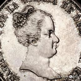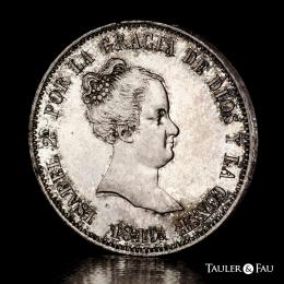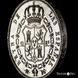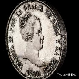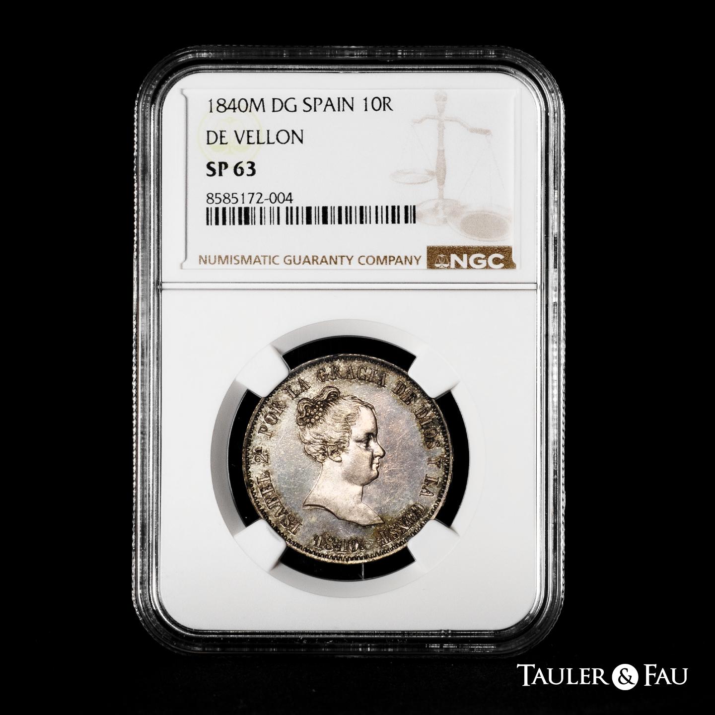 Isabel II (1833-1868). 10 reales. 1840. Madrid. DG (Departamento de Grabado). (Cal-519). Ae. 13,52 g. Pleno brillo original con un suave tono que acentúa su extraordinario atractivo visual. Magnífico ejemplar. Rarísima. Encapsulada por NGC como SP 63. Solamente 1 ejemplar mejor conservado según el censo de NGC. Est...7000,00.