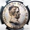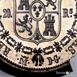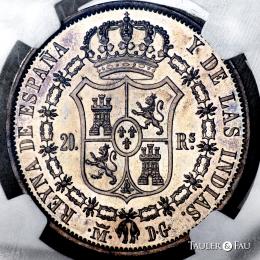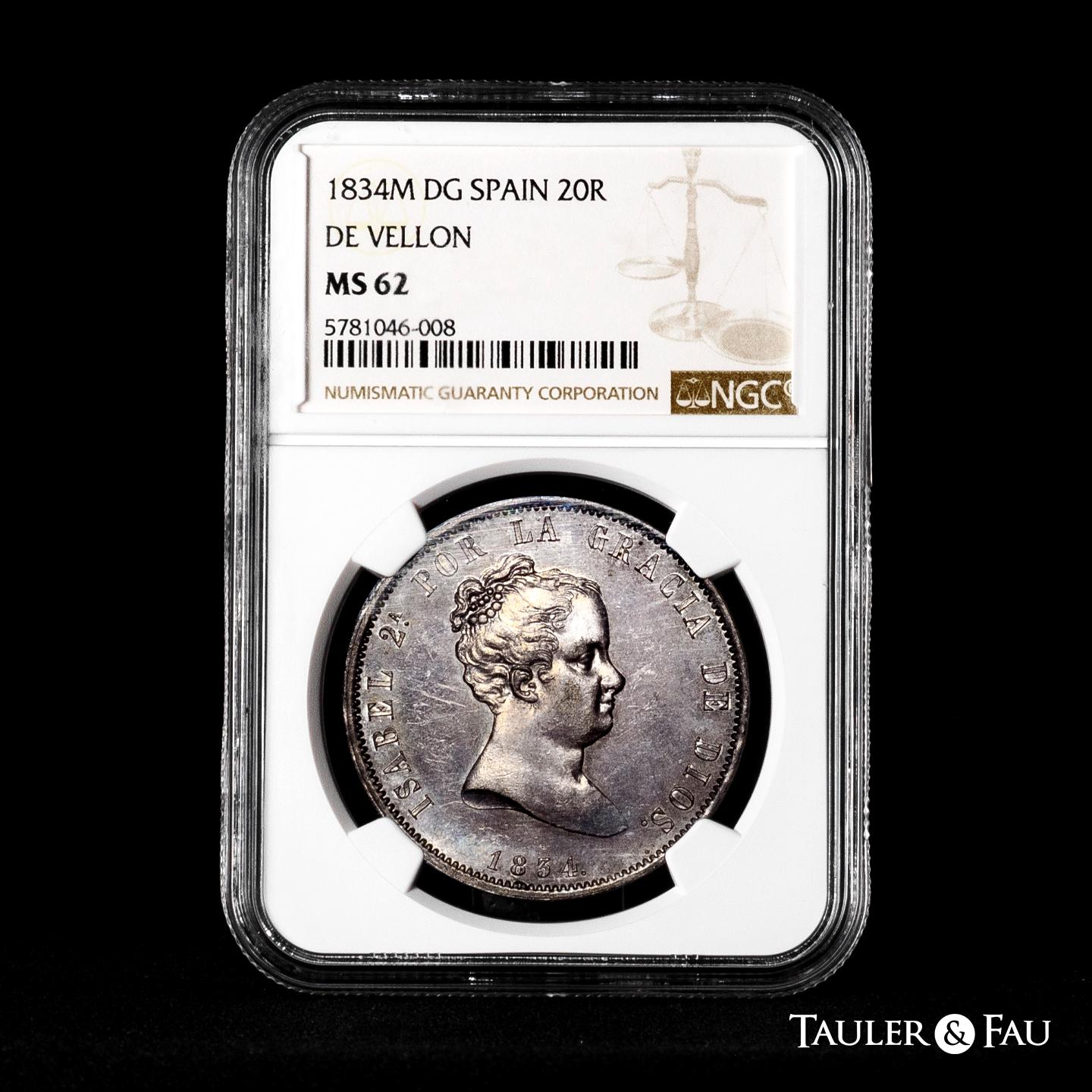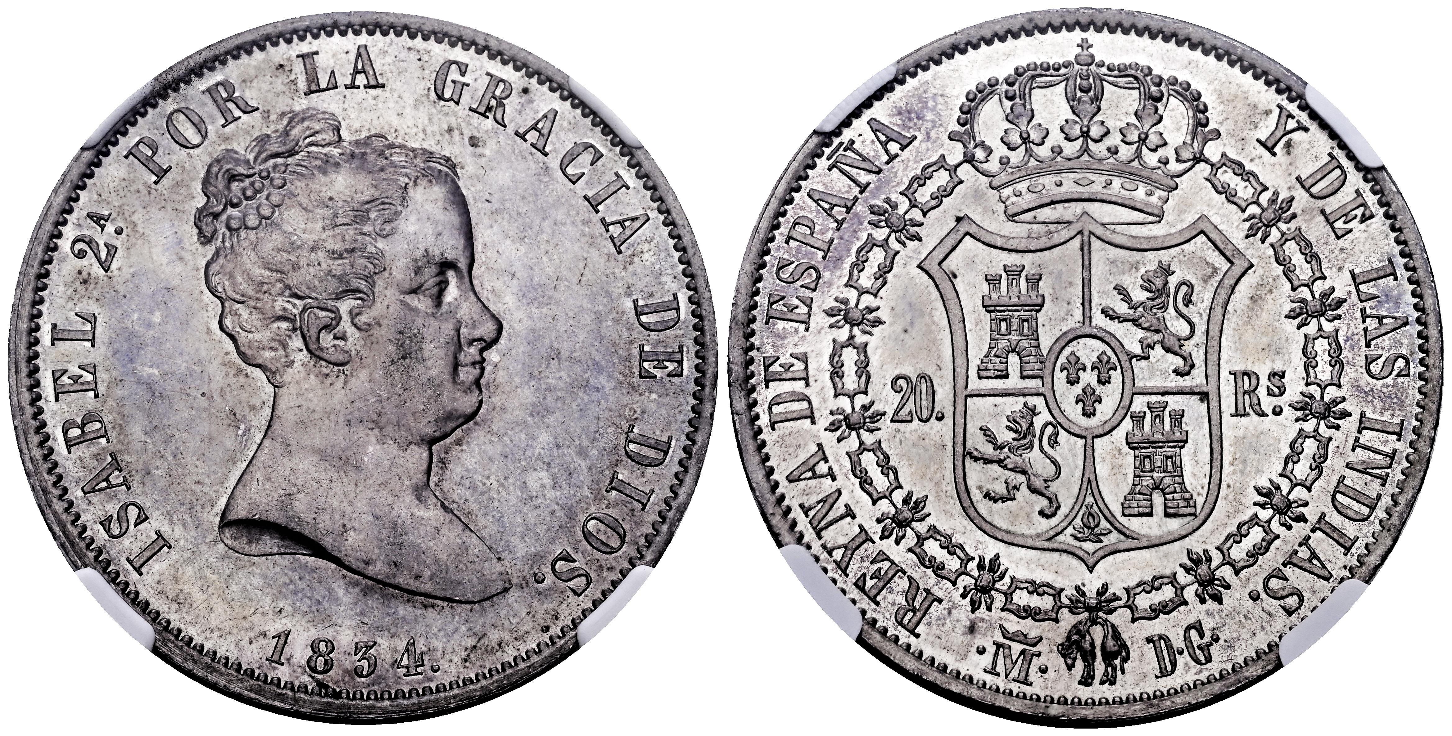 Isabel II (1833-1868). 20 reales. 1834. Madrid. DG (Departamento de Grabado). (Cal-577). Ag. Magnífico ejemplar. Preciosa pátina de monetario con brillo original subyacente. Rarísima, solo 10 ejemplares conocidos. Encapsulada por NGC como MS 62. (Top Pop), el mejor ejemplar conservado en el censo de NGC. Est...10000,00.