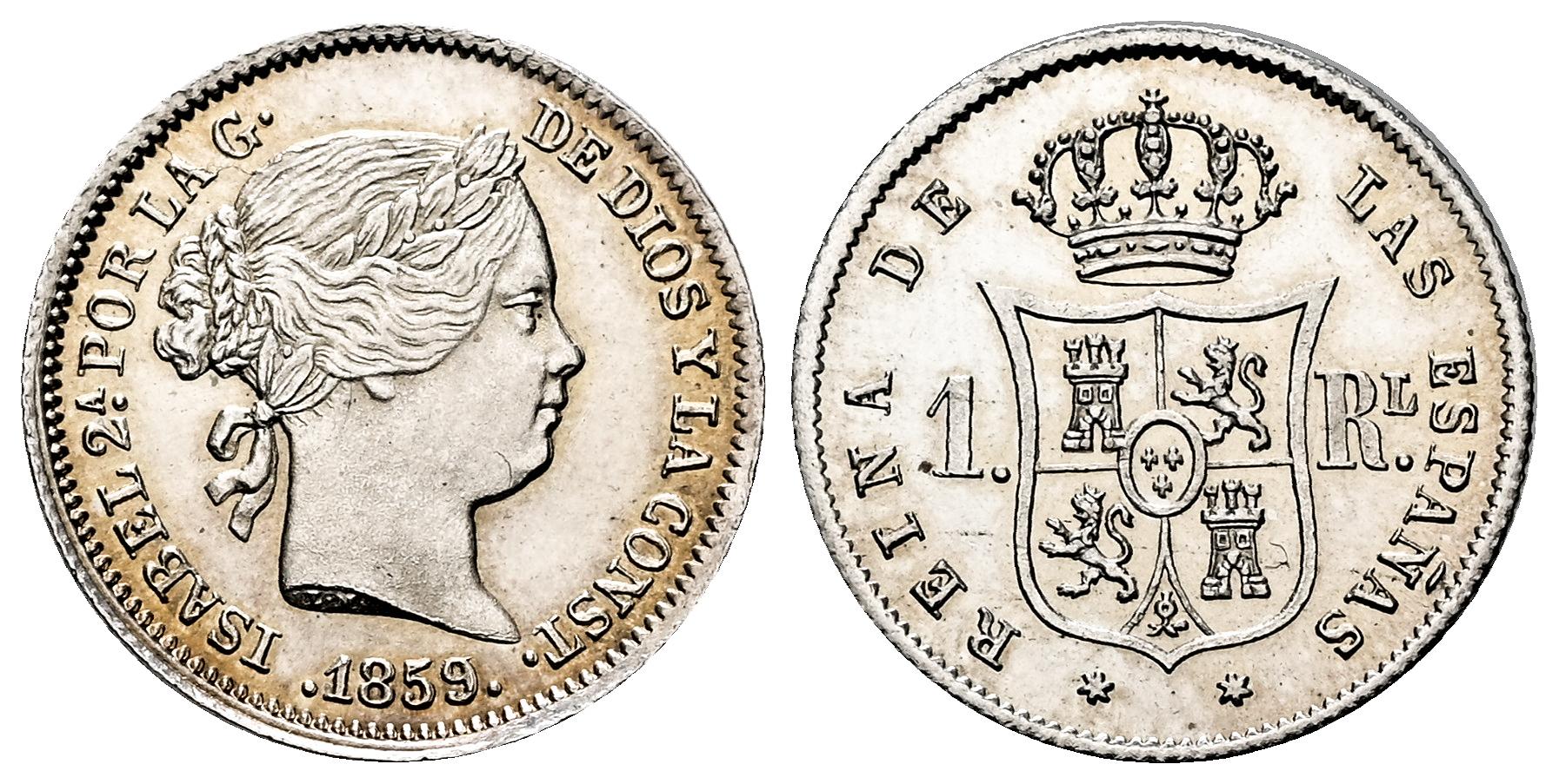 Isabel II (1833-1868). 1 real. 1859. Madrid. (Cal-308). Ag. 1,31 g. Magnífico ejemplar. Brillo original. Rara así. Ex Tauler&Fau (22/09/2020), lote 377. SC. Est...150,00.