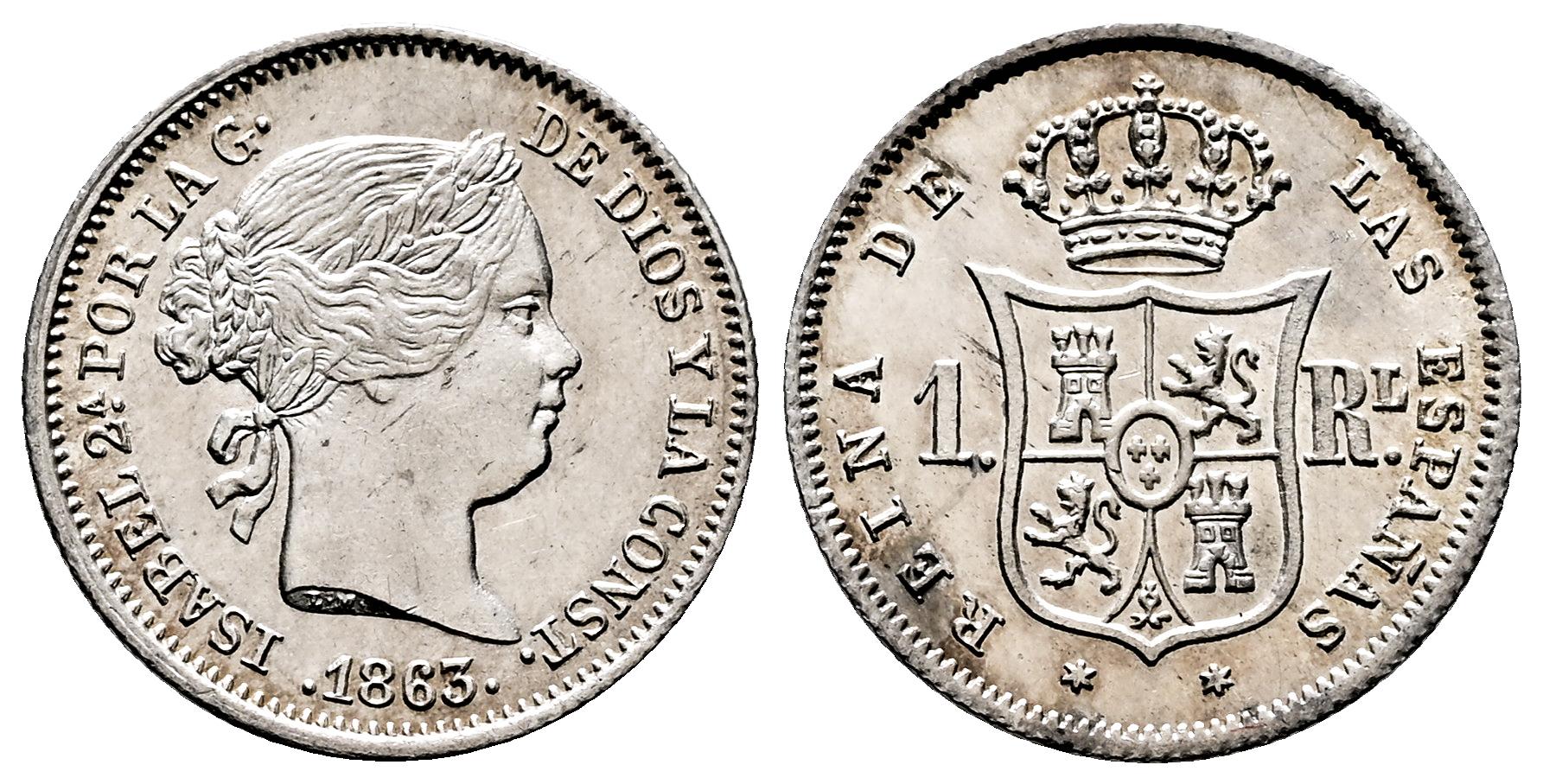 Isabel II (1833-1868). 1 real. 1863/0. Madrid. (Cal-Pdf. 311.1). Ag. 1,29 g. Rara sobrefecha. Brillo original y muy atractiva. Mínimas rayitas. EBC+. Est...150,00.
