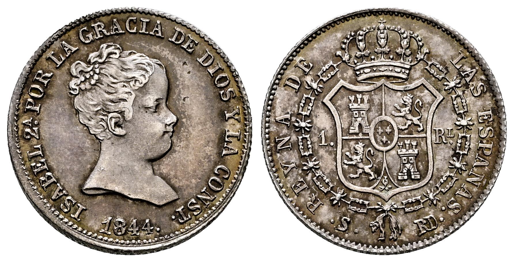 Isabel II (1833-1868). 1 real. 1844. Sevilla. RD. (Cal-315). Ag. 1,38 g. Suave y bonito tono. Muy escasa. EBC. Est...180,00.