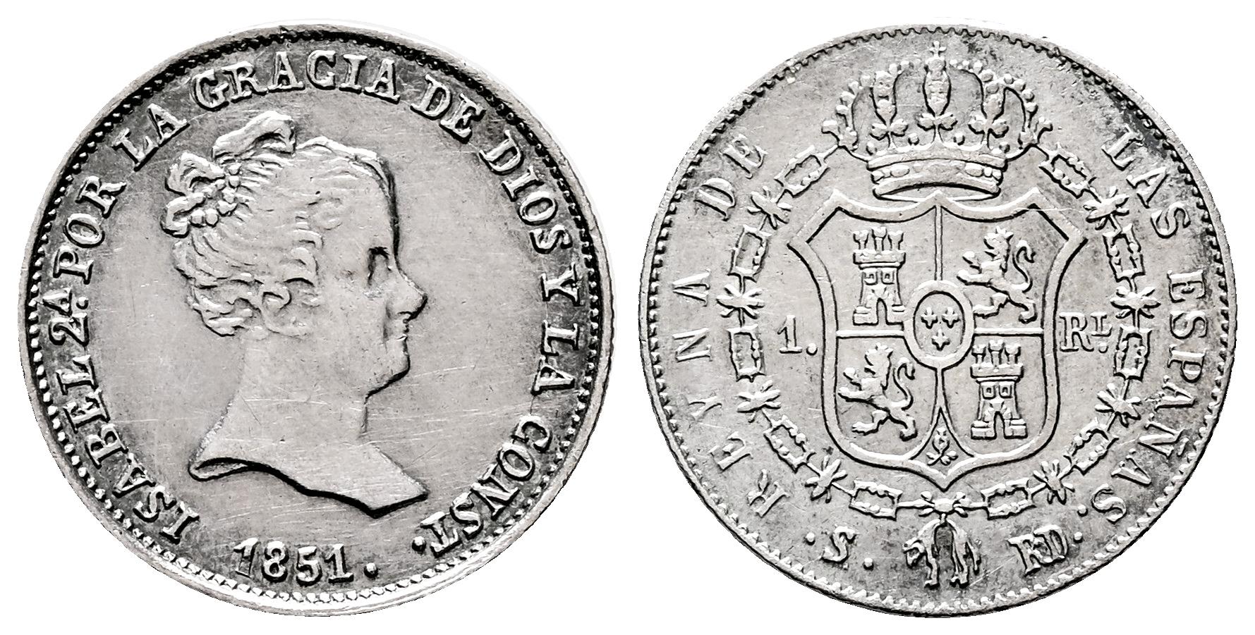 Isabel II (1833-1868). 1 real. 1851. Sevilla. RD. (Cal-319). Ag. 1,25 g. Ligeramente limpiada. Ex Áureo (02/06/2004), lote 571. EBC. Est...35,00.