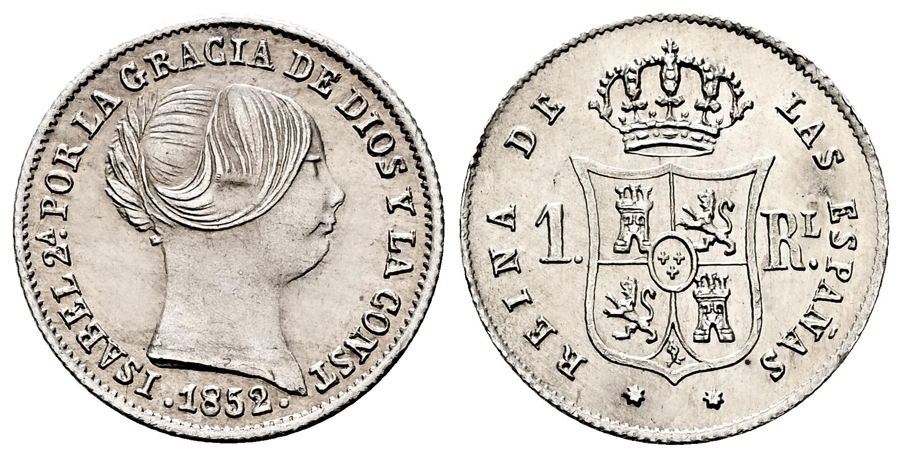 Isabel II (1833-1868). 1 real. 1852/1. Sevilla. (Cal-No cita). Ag. 1,28 g. Reverso girado 90º. Sobrefecha. Restos de brillo original. Escasa. Ex Áureo&Calicó (21/09/2010), lote 1244. EBC-. Est...150,00.