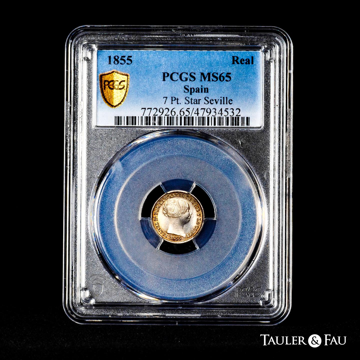 Isabel II (1833-1868). 1 real. 1855. Sevilla. (Cal-325). Ag. Ligero tono con de brillo original. Rara en esta conservación. Encapsulada por PCGS como MS 65. Solamente 1 ejemplar mejor conservado según el censo de PCGS. Est...300,00.