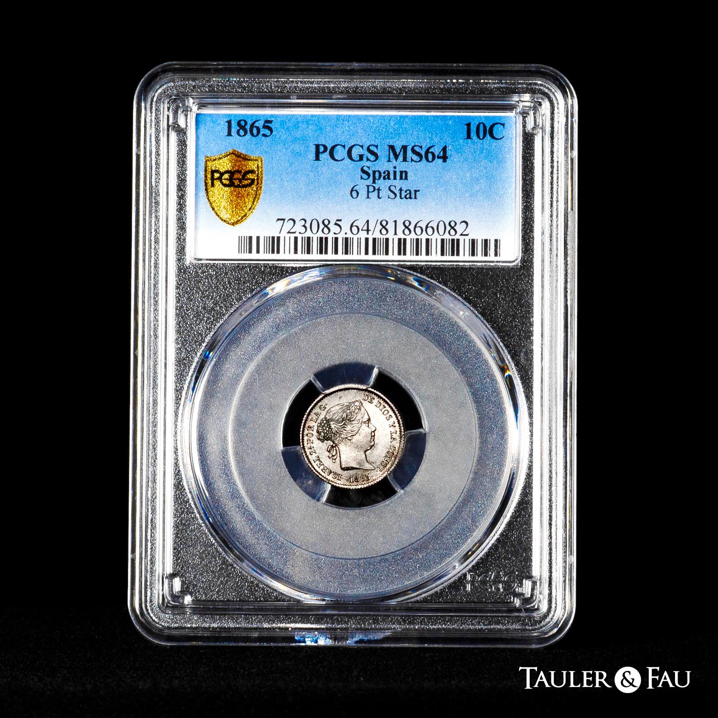 Isabel II (1833-1868). 10 céntimos de escudo. 1865. Madrid. (Cal-338). Ag. Muy rara en esta conservación. Encapsulada por PCGS como MS 64 (Top Pop), el mejor ejemplar conservado en el censo de PCGS. Est...200,00.