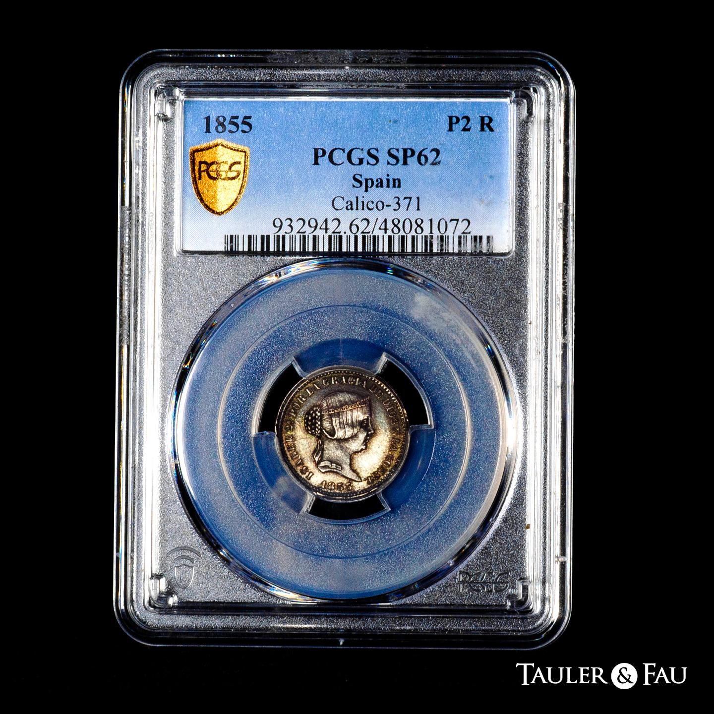 Isabel II (1833-1868). 2 reales. 1855. Madrid. (Cal-371). Ag. Prueba no adoptada de Fernández Pescador. Bonita pátina. Brillo original. Rarísima. Encapsulada por PCGS como SP 62. (Top Pop), el mejor ejemplar conservado en el censo de PCGS. Ex Tauler&Fau Selection (26/11/2024), lote 258. Est...2000,00.