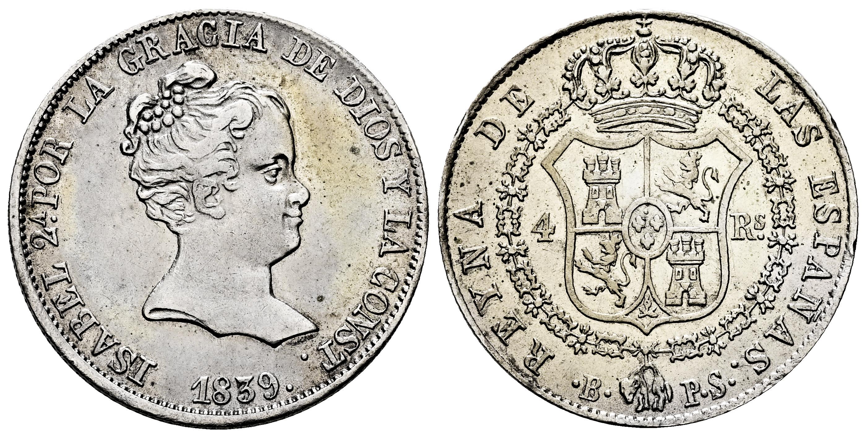 Isabel II (1833-1868). 4 reales. 1839. Barcelona. PS. (Cal-413). Ag. 5,85 g. Rara. Ex Áureo&Calicó (14/12/2002), lote 1631. EBC-. Est...200,00.