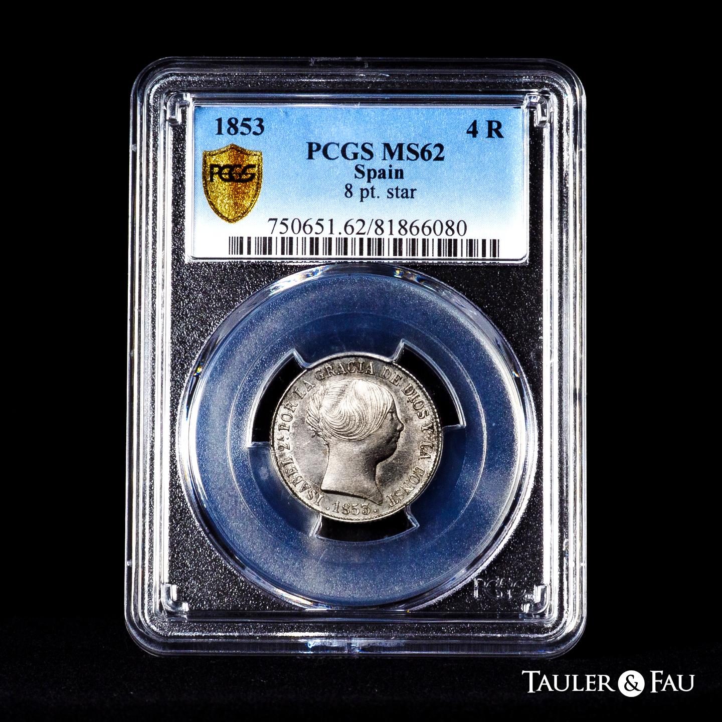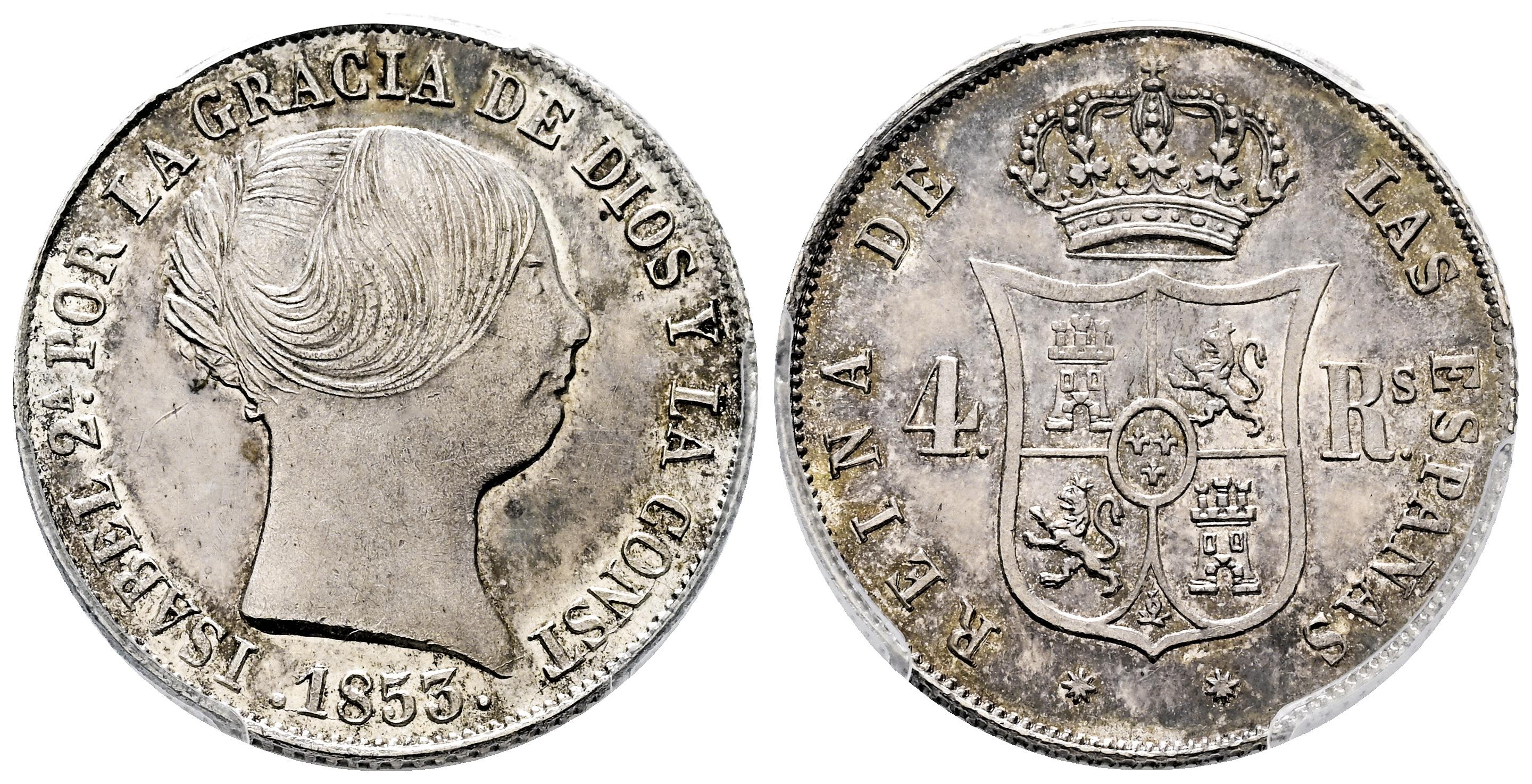 Isabel II (1833-1868). 4 reales. 1853. Barcelona. (Cal-426). Ag. Suave tono. Brillo original. Rara en esta conservación. Encapsulada por PCGS como MS 62 (Top Pop), el mejor ejemplar conservado en el censo de PCGS. Est...250,00.