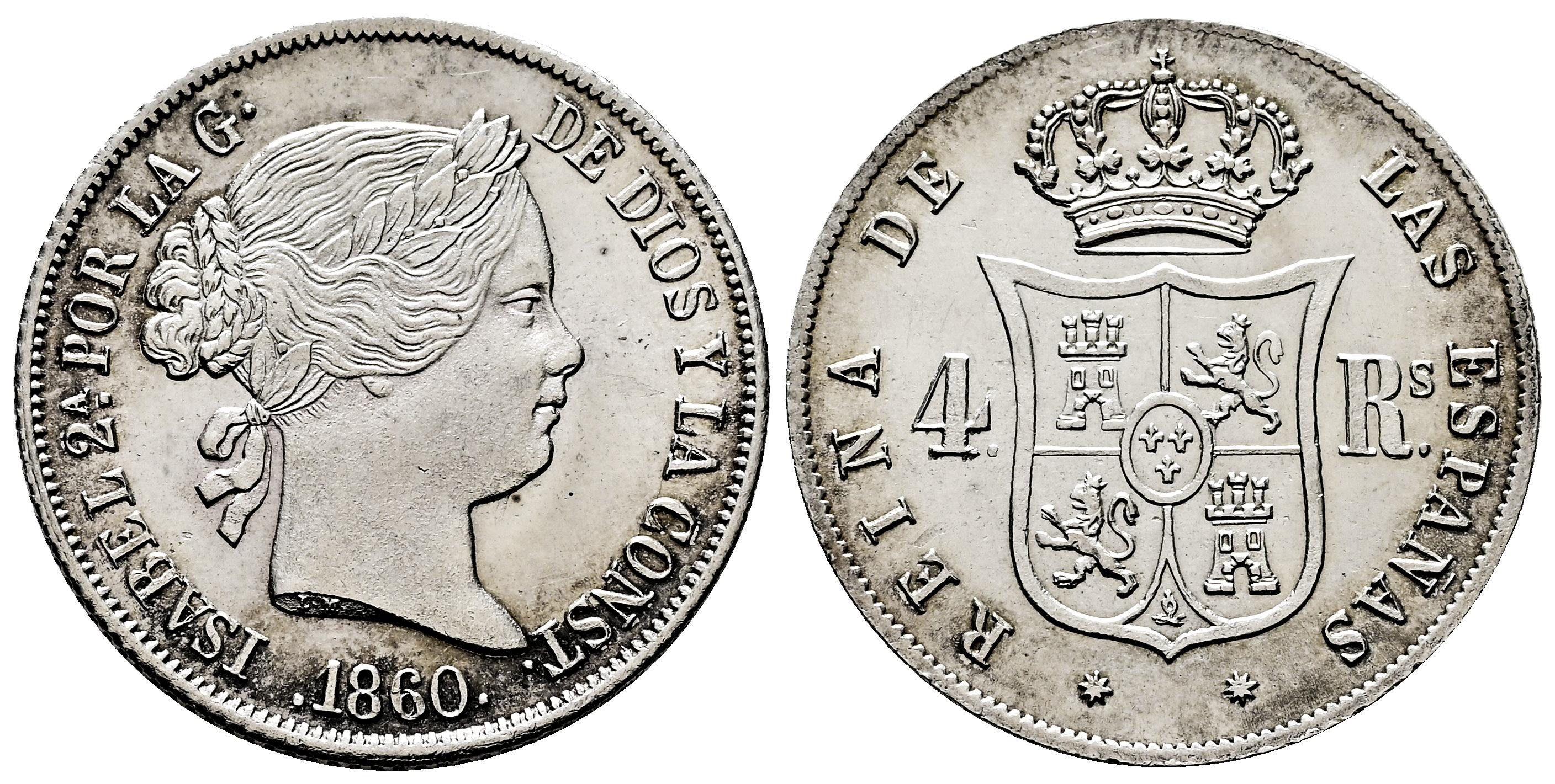 Isabel II (1833-1868). 4 reales. 1860. Barcelona. (Cal-434). Ag. 5,12 g. Magnífico ejemplar. Brillo original. Rara en esta conservación. Ex Colección Isabel de Trastámara, Áureo&Calicó (29/10/2015), lote 113. SC. Est...500,00.