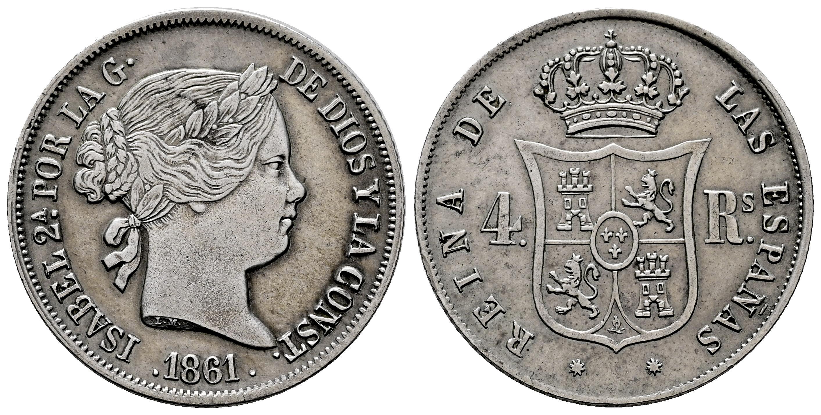 Isabel II (1833-1868). 4 reales. 1861. Barcelona. (Cal-435). Ag. 5,17 g. Ligeramente limpiada. MBC+. Est...75,00.