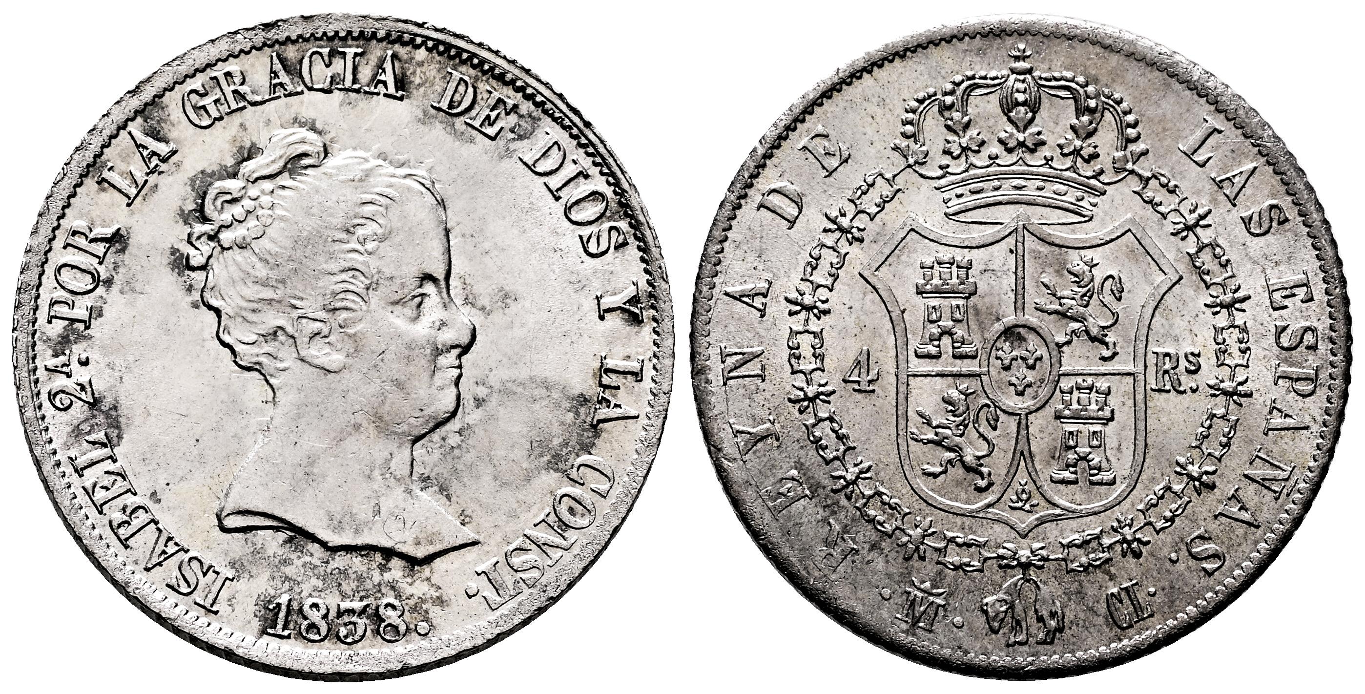 Isabel II (1833-1868). 4 reales. 1838. Madrid. CL. (Cal-445). Ag. 6,00 g. Precioso ejemplar. Suave tono. Brillo original. Rara en esta conservación. SC/SC-. Est...320,00.