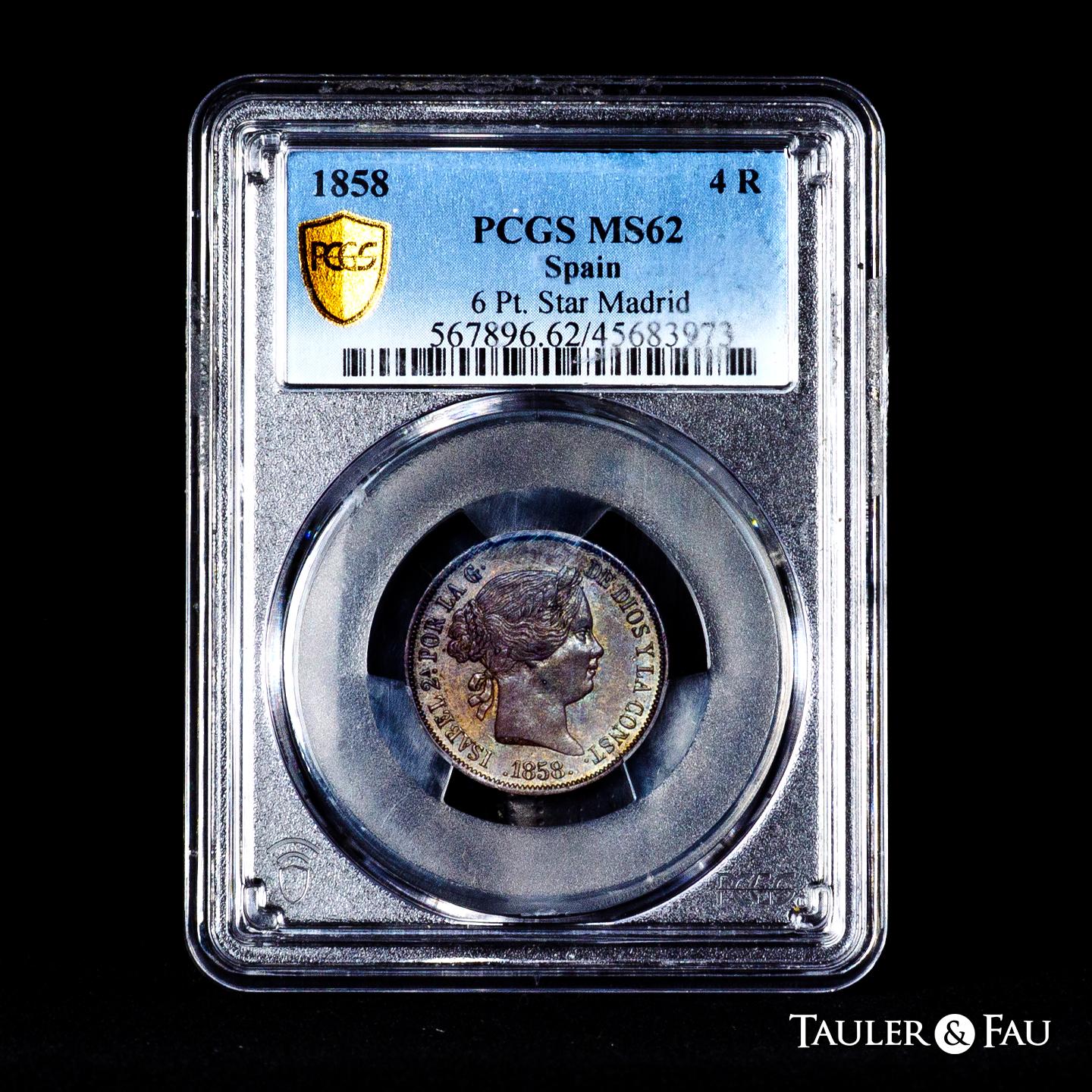 Isabel II (1833-1868). 4 reales. 1858. Madrid. (Cal-464). Ag. Bonita pátina de monetario con brillo original subayacente. Rara en esta conservación. Encapsulada por PCGS como MS 62. Solamente 1 ejemplar mejor conservado según el censo de PCGS. Est...200,00.