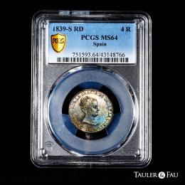 Isabel II (1833-1868). 4 reales. 1839. Sevilla. RD. (Cal-477). Ag. Preciosa pátina con ligeros tonos azulados y brillo original subyacente. Muy rara en esta conservación. Encapsulada por PCGS como MS 64. (Top Pop), el mejor ejemplar conservado en el censo de PCGS. Est...400,00.