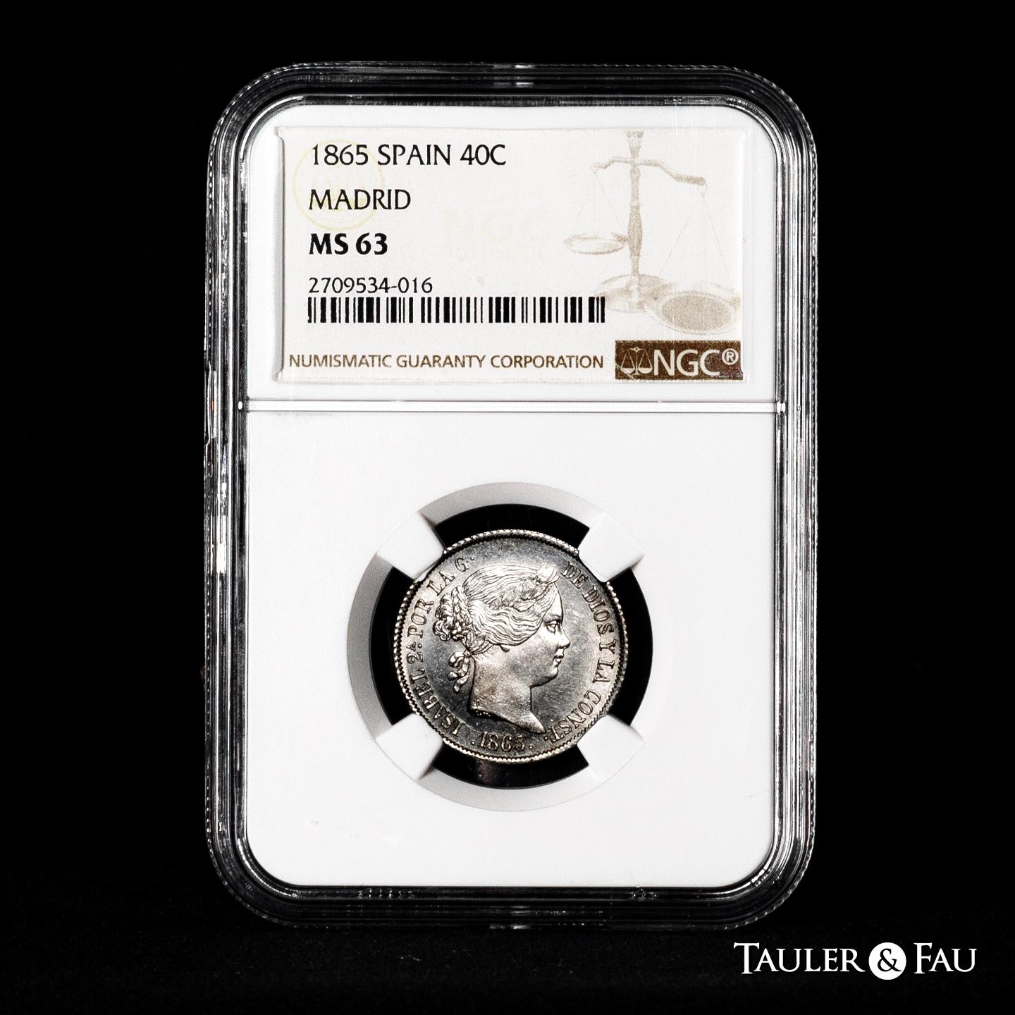 Isabel II (1833-1868). 40 céntimos de escudo. 1865. Madrid. (Cal-500). Ag. Brillo original. Atractivo ejemplar. Escasa en esta conservación. Encapsulada por NGC como MS 63. Est...300,00.