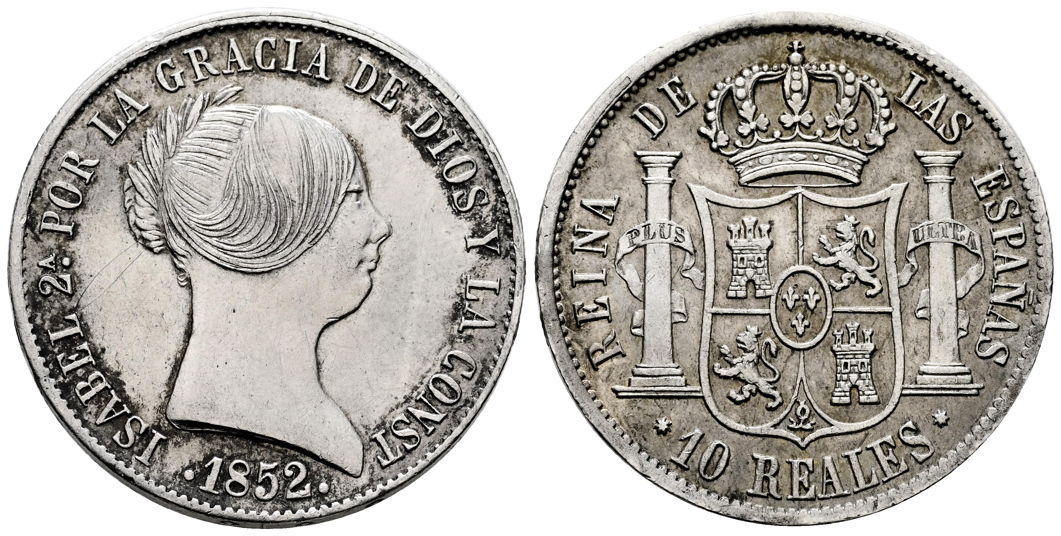 Isabel II (1833-1868). 10 reales. 1852. Sevilla. (Cal-547). Ae. 12,94 g. Suave pátina. Restos de brillo original. Leve roce en anverso. Escasa. EBC. Est...150,00.