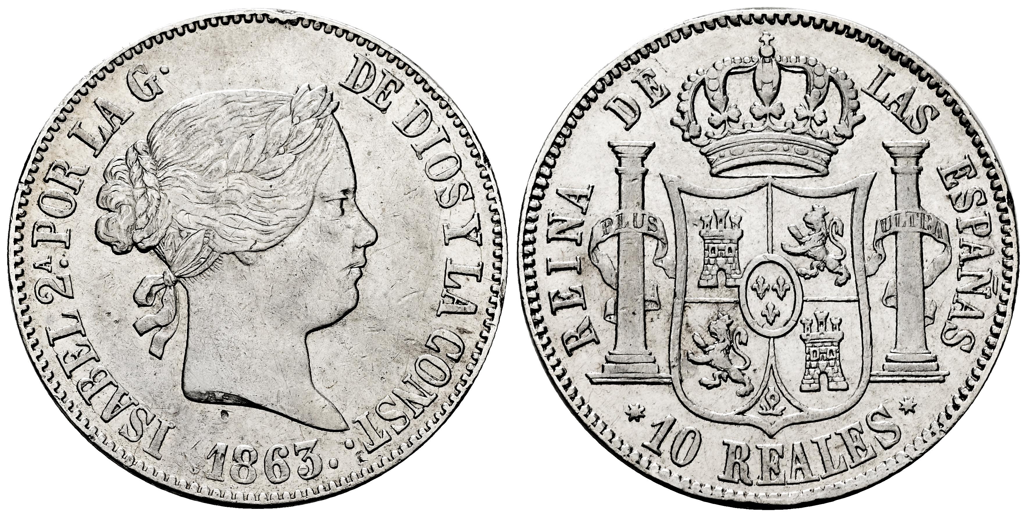 Isabel II (1833-1868). 10 reales. 1863. Sevilla. (Cal-561). Ae. 12,93 g. Limpiada. Golpecitos. Escasa. MBC/MBC+. Est...70,00.