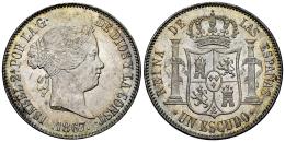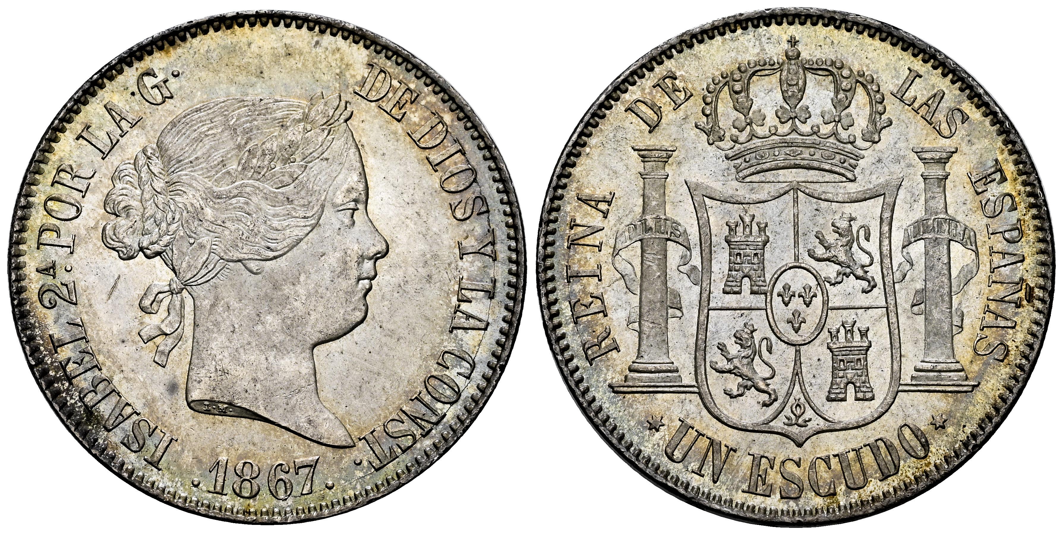 Isabel II (1833-1868). 1 escudo. 1867. Madrid. (Cal-565). Ag. 12,90 g. Suave y atractivo tono iridiscente en las periferias. Brillo original. Rayita en el anverso. Escasa en esta conservación. EBC+/SC-. Est...200,00.