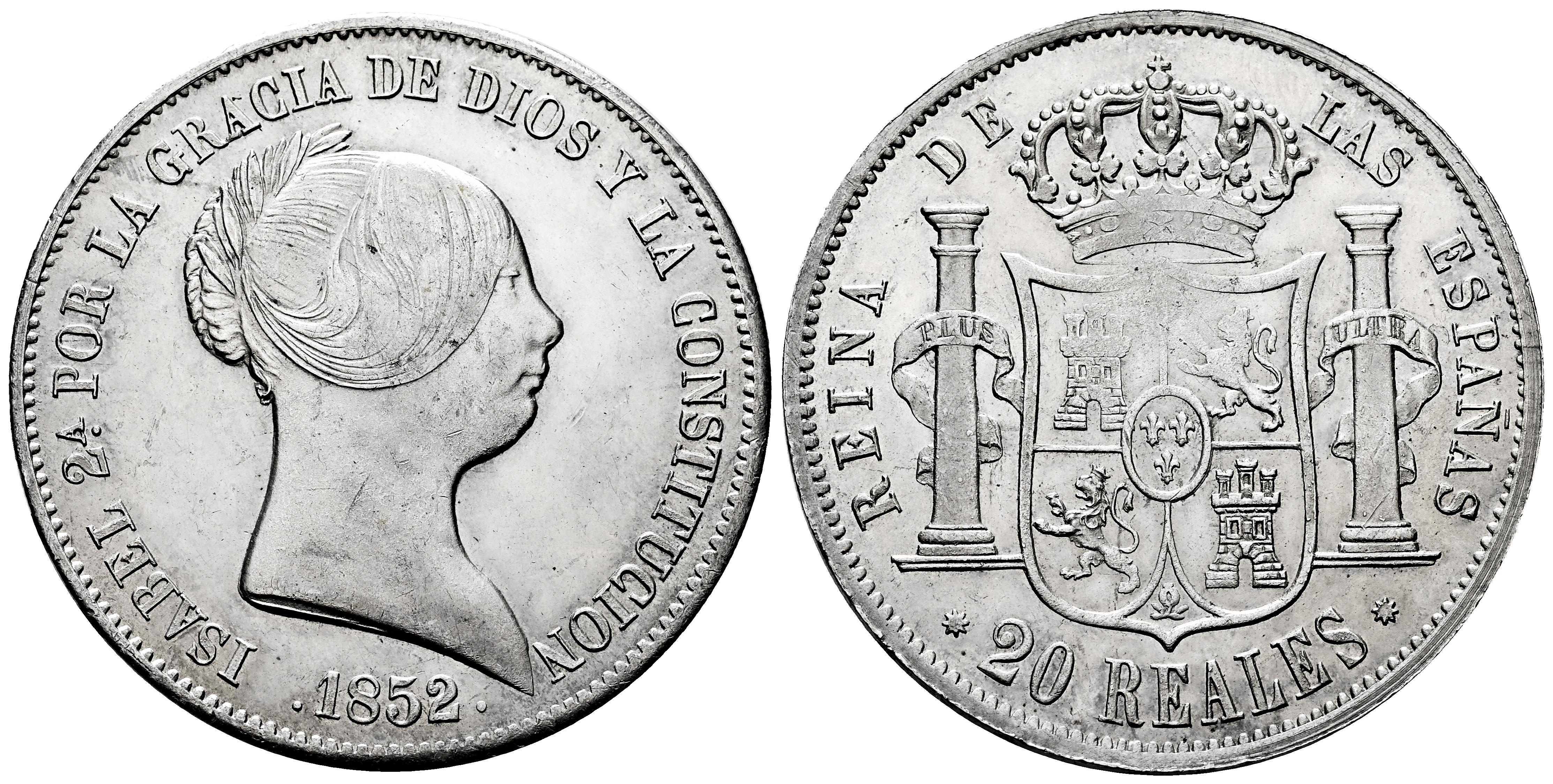 Isabel II (1833-1868). 20 reales. 1852. Barcelona. (Cal-571). Ag. 26,18 g. Restos de brillo original. Acuñación algo débil en reverso. Mínimos golpecitos. Rara. Ex Colección Isabel de Trastámara, Áureo&Calicó (29/10/2015), lote 1214. EBC-/EBC. Est...1200,00.
