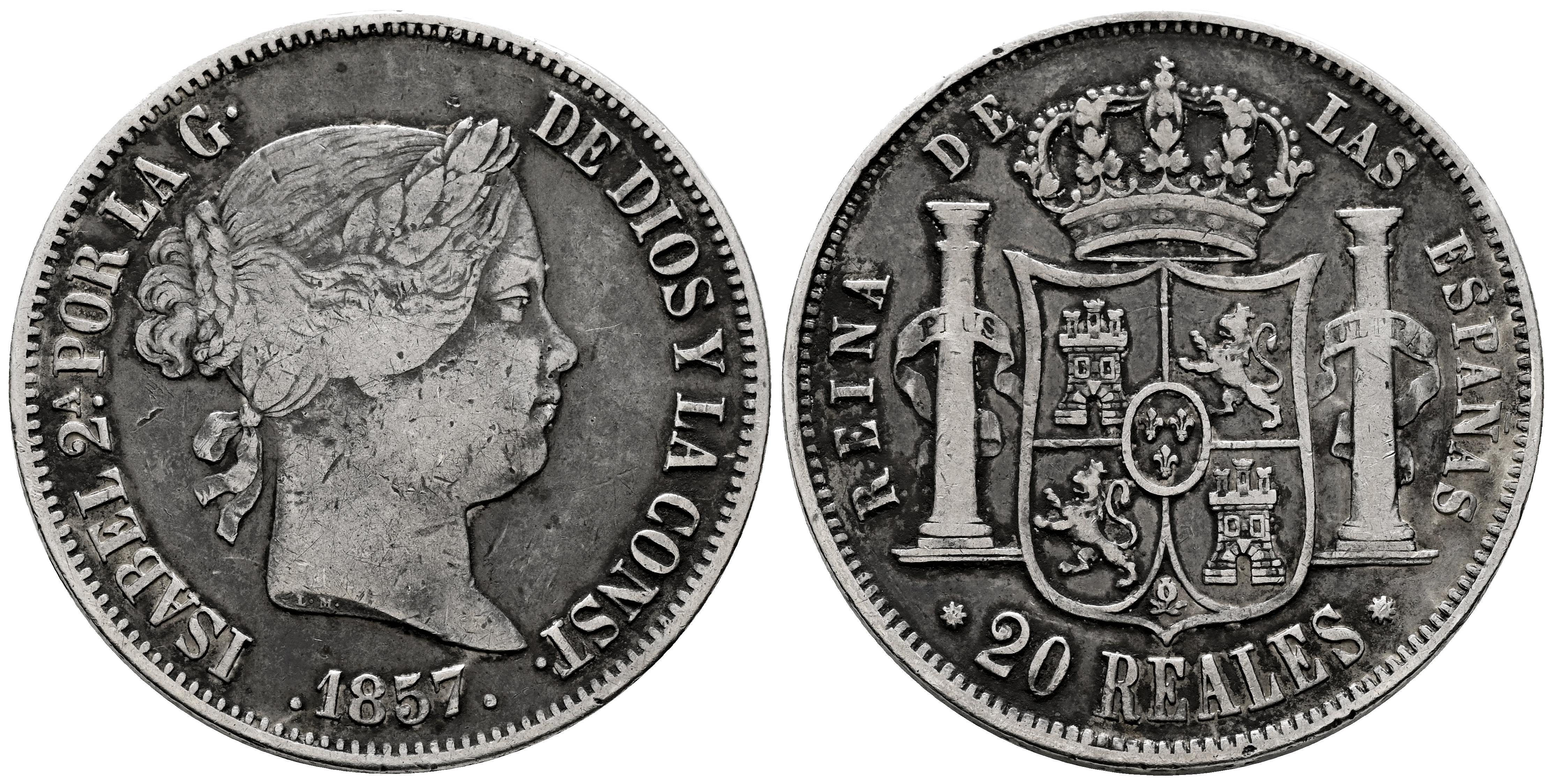 Isabel II (1833-1868). 20 reales. 1857. Barcelona. (Cal-572). Ag. 25,78 g. Pátina. Rara. MBC-. Est...650,00.