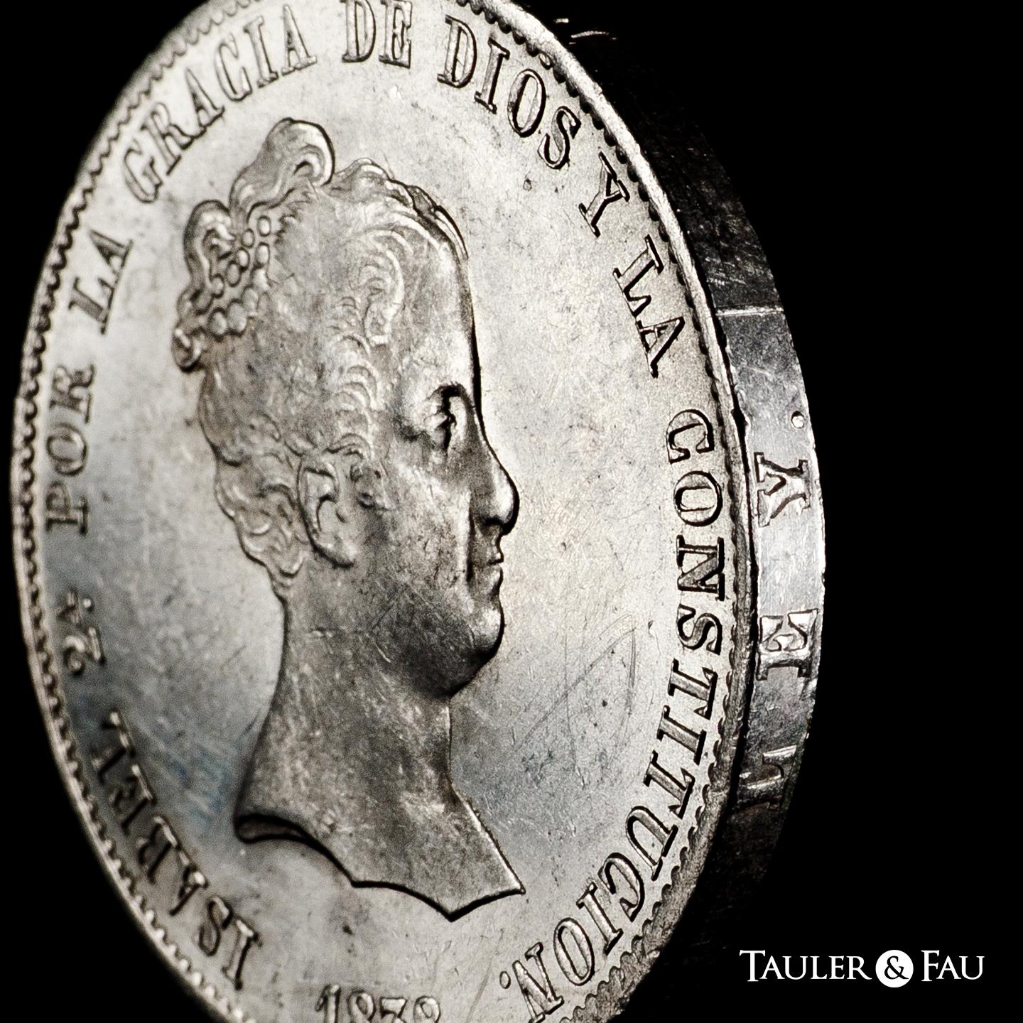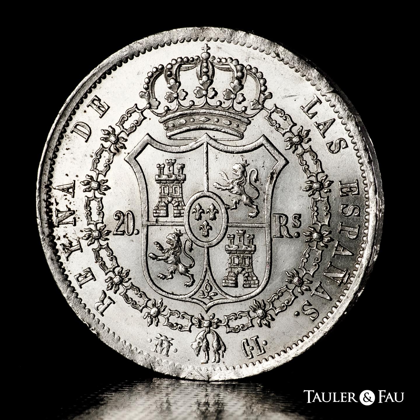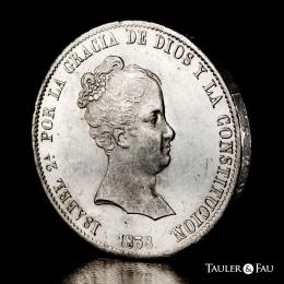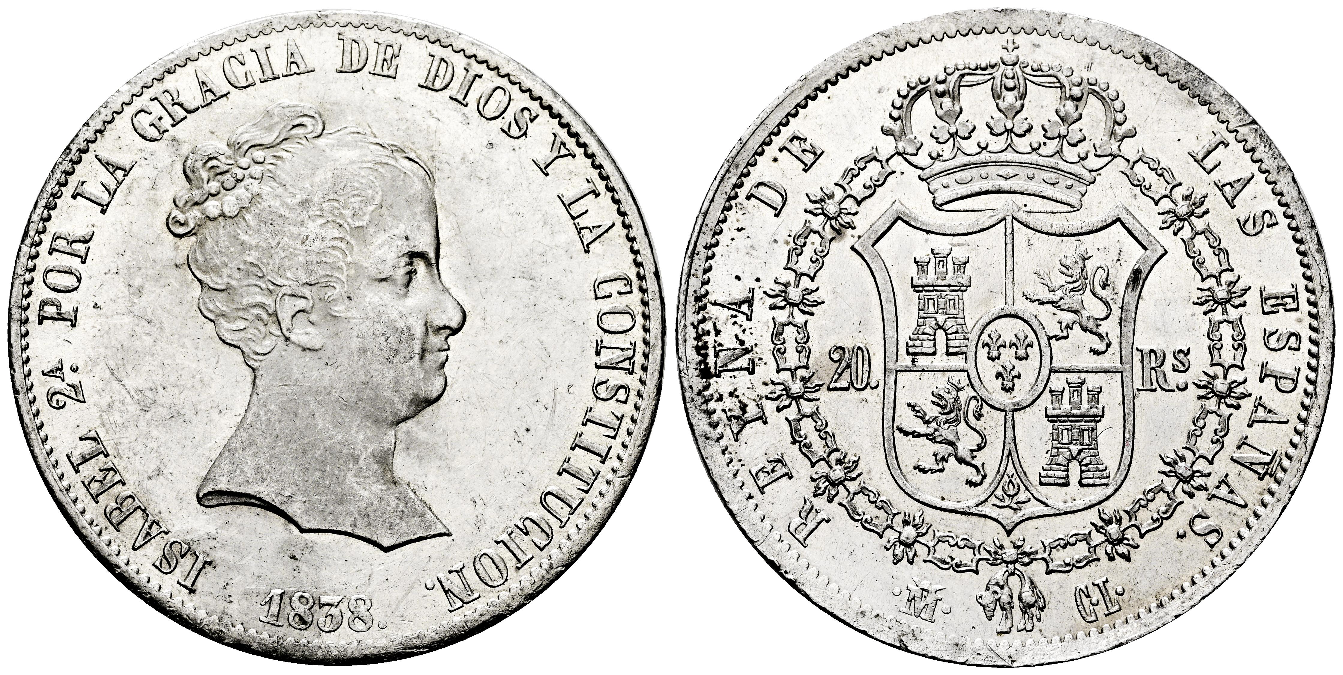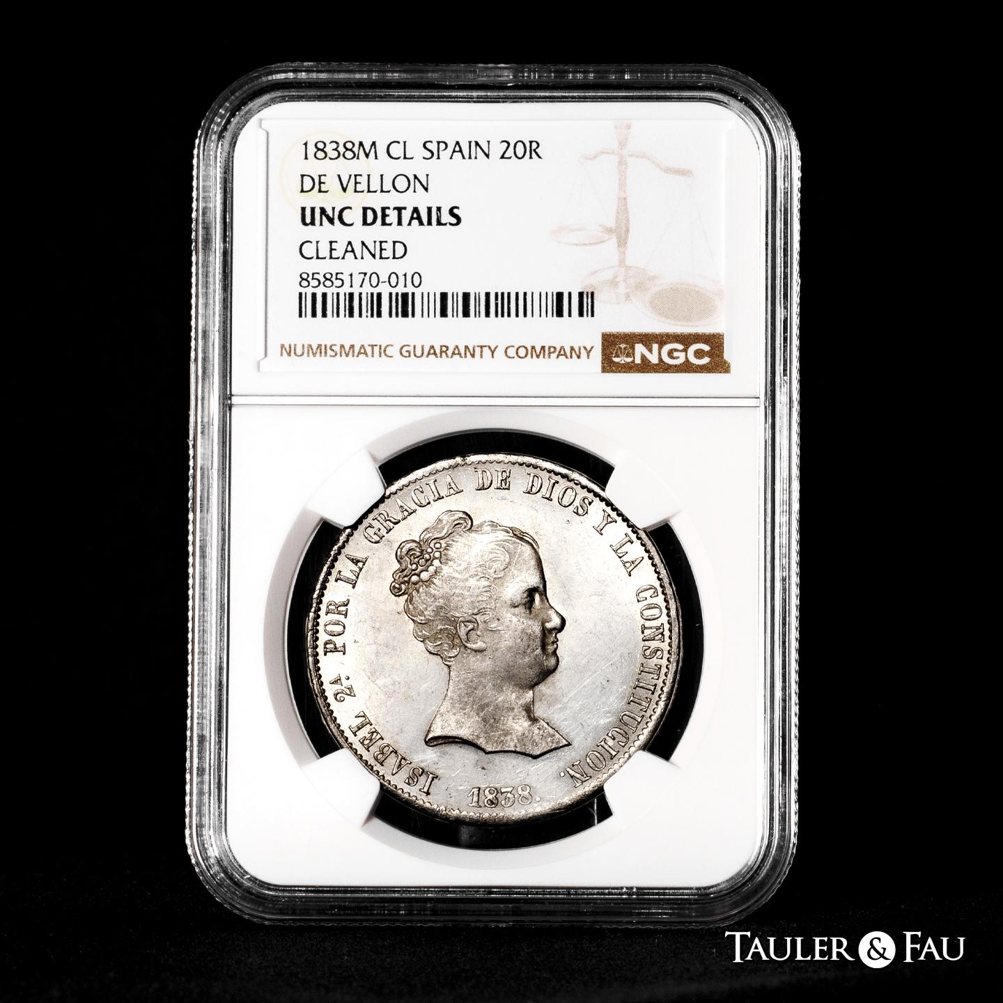 Isabel II (1833-1868). 20 reales. 1838. Madrid. CL. (Cal-582). Ag. 26,90 g. Pleno brillo original. Ligeramente frotada bajo el busto y leves marquitas. Atractiva y rara en esta conservación. Encapsulada por NGC como UNC Details, Cleaned. Est...1200,00.