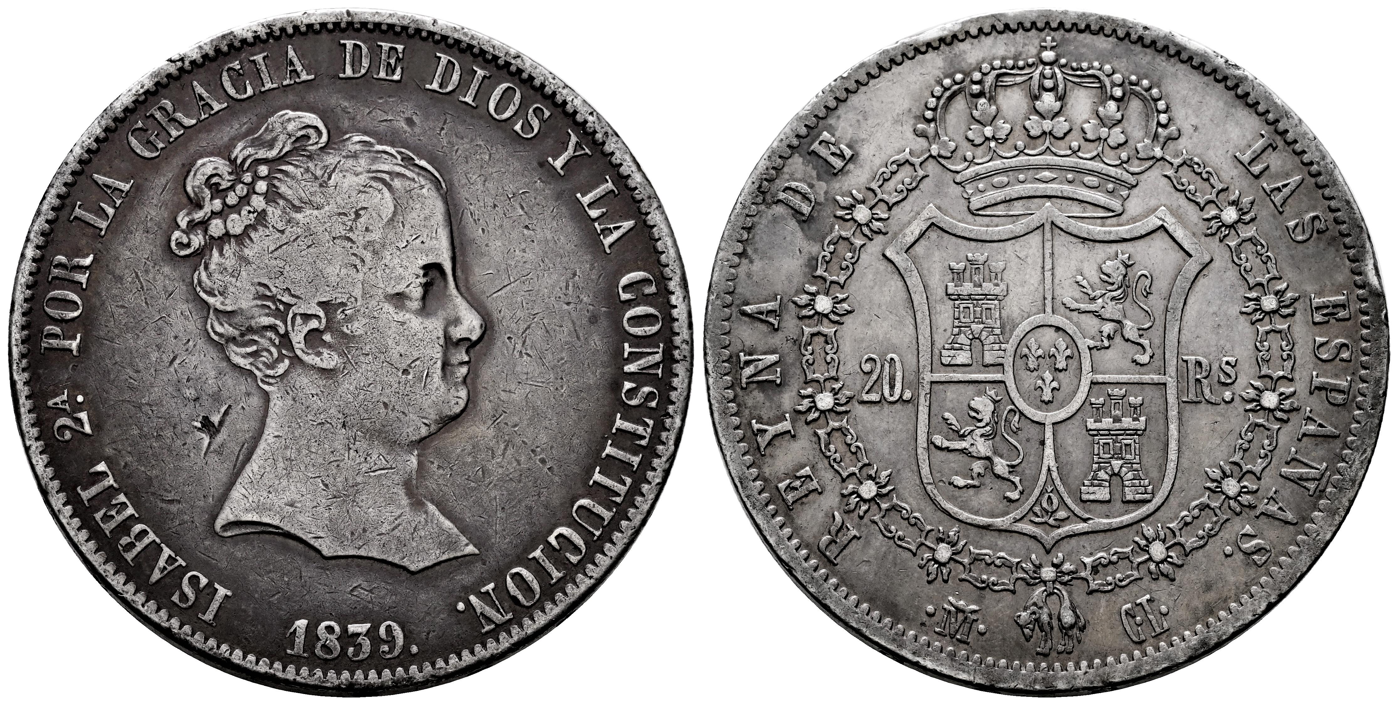 Isabel II (1833-1868). 20 reales. 1839. Madrid. CL. (Cal-583). Ag. 26,87 g. Suave pátina con ligero tono. Hojita en anverso y pequeñas marcas. Muy rara. MBC/MBC+. Est...900,00.